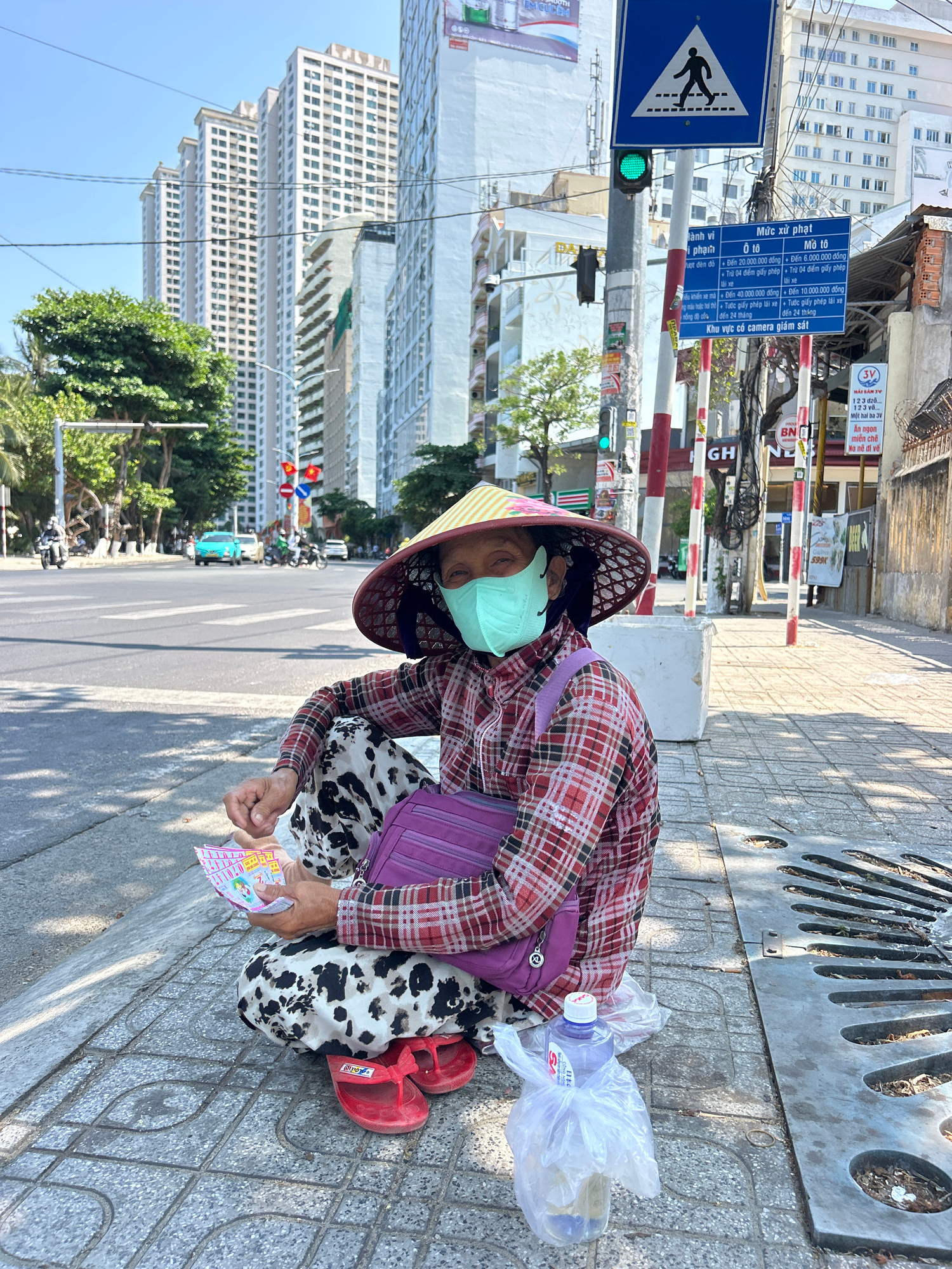 A woman wearing a conical hat, a face mask, a red plaid shirt, and dalmatian-print pants is crouched on a sidewalk on a sunny day. She is holding lottery tickets. Beside her is a purple bag, a bottle…read more
