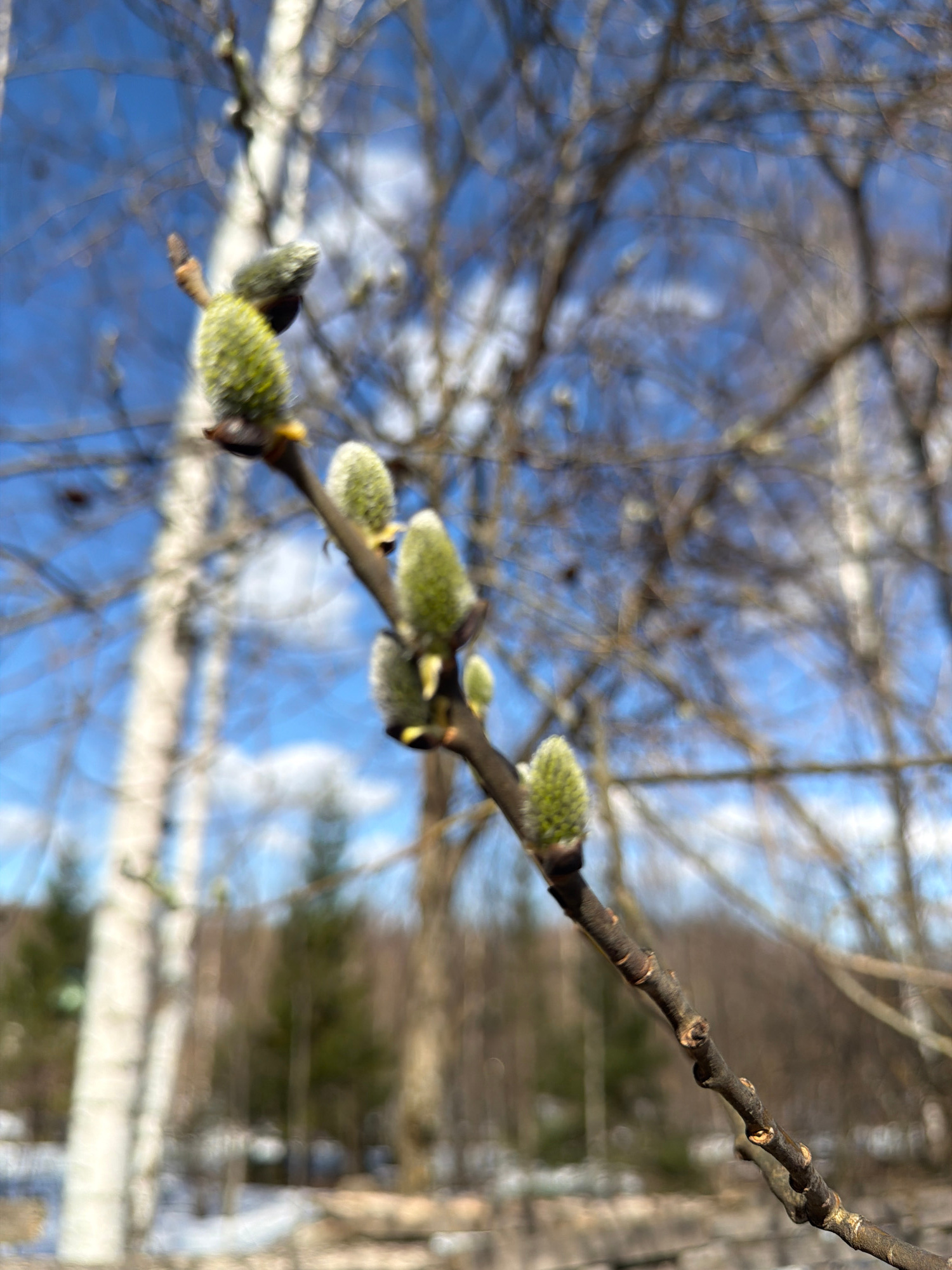 A close-up shot of a slender, brown branch bearing fuzzy, green catkins. The background is intentionally blurred, revealing a patch of blue sky interlaced with a network of bare branches. In the out-o…read more