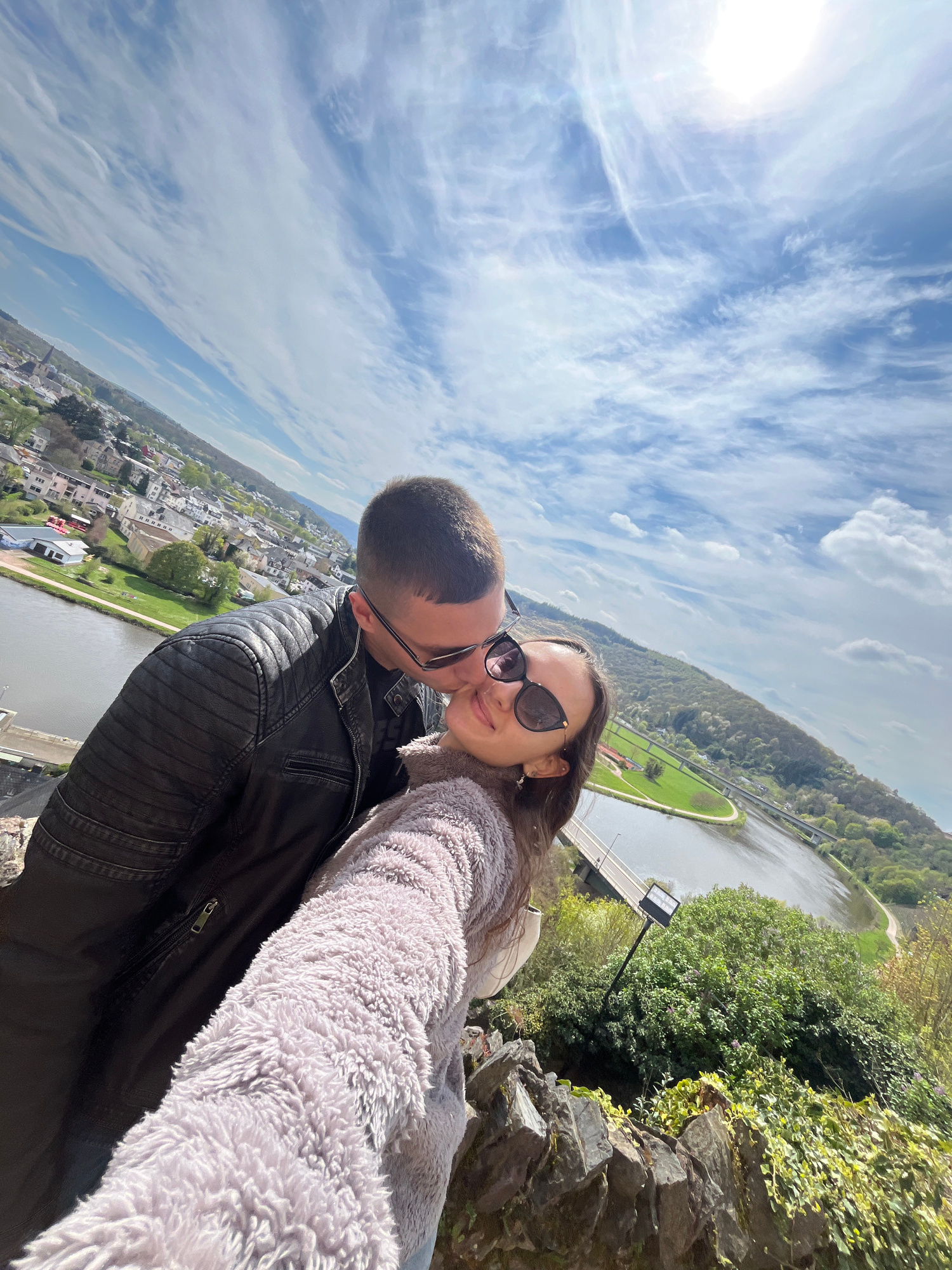 A couple takes a selfie overlooking Saarburg, Germany, on a bright, sunny day with a blue sky dotted with clouds. The perspective is canted to the left, placing the sky and cityscape at an angle. The…read more