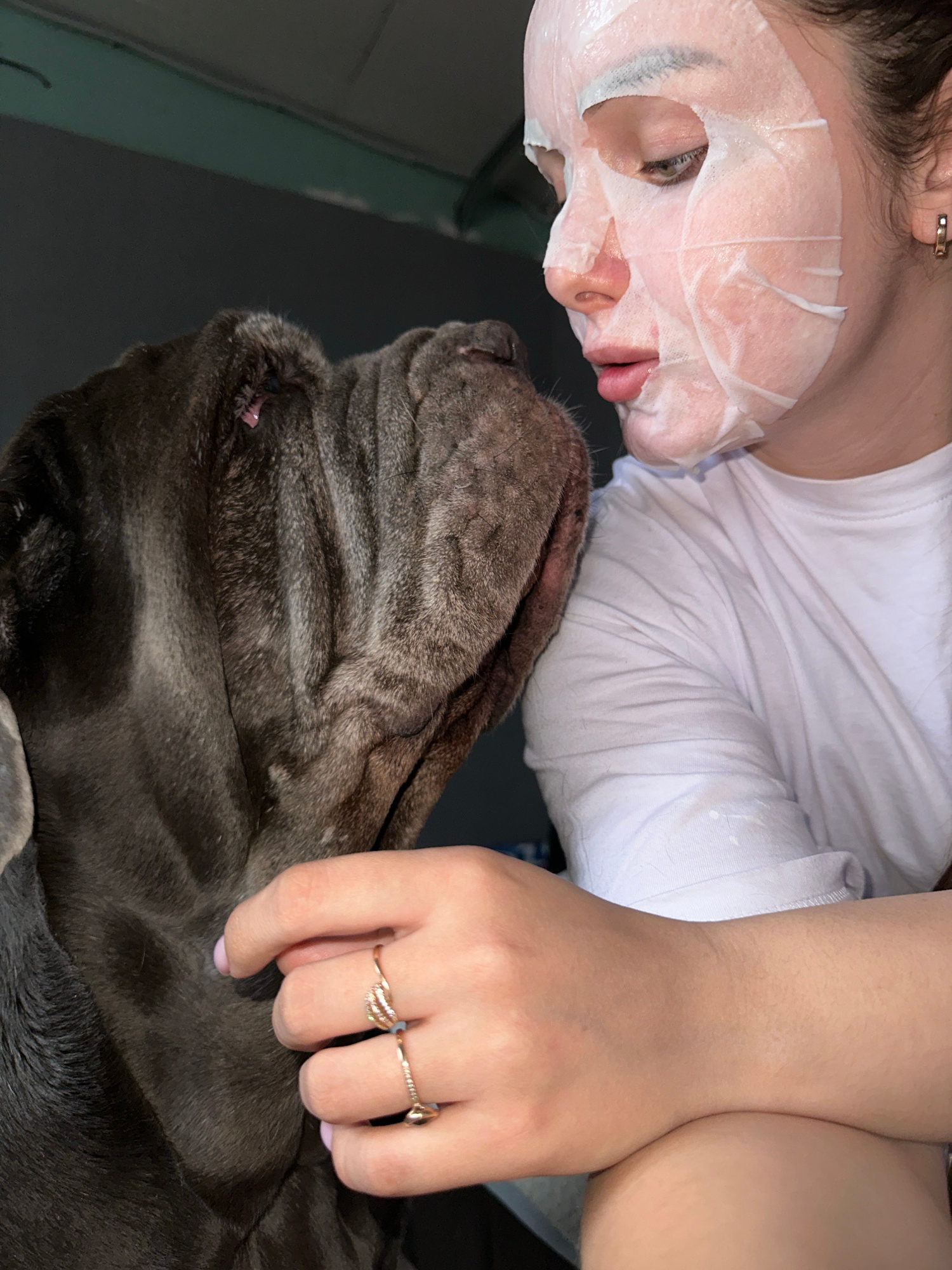 A woman with a facial mask is shown in close proximity to a large, gray Shar-Pei dog. The woman is wearing a white t-shirt. She has two rings on her fingers. The scene's location in Ludorvay, Russia,…read more