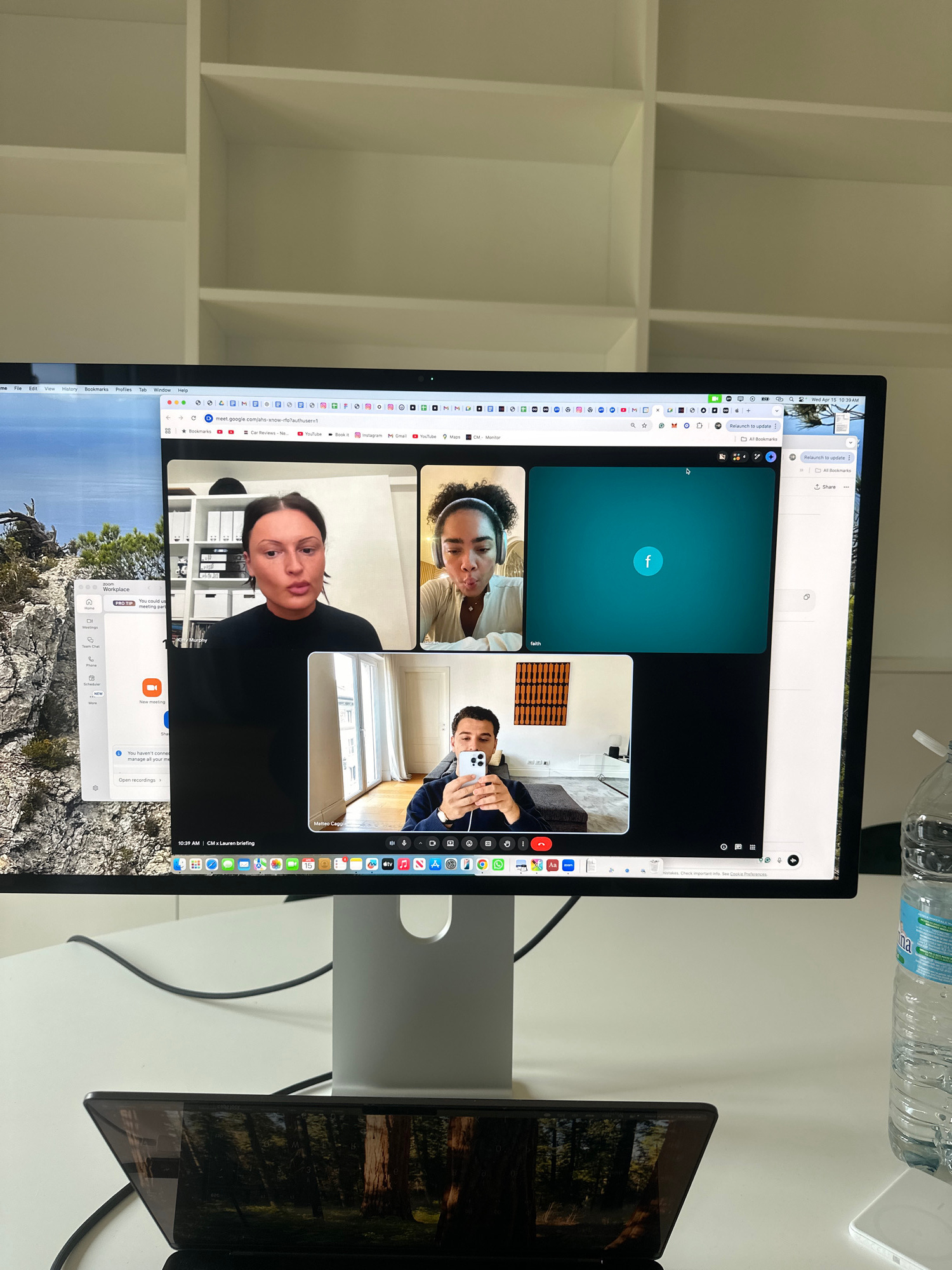 The image depicts a video call on a computer screen, showing three people on a video conference. One is represented by a blue "f," indicating the person is not broadcasting video. The other two people…read more
