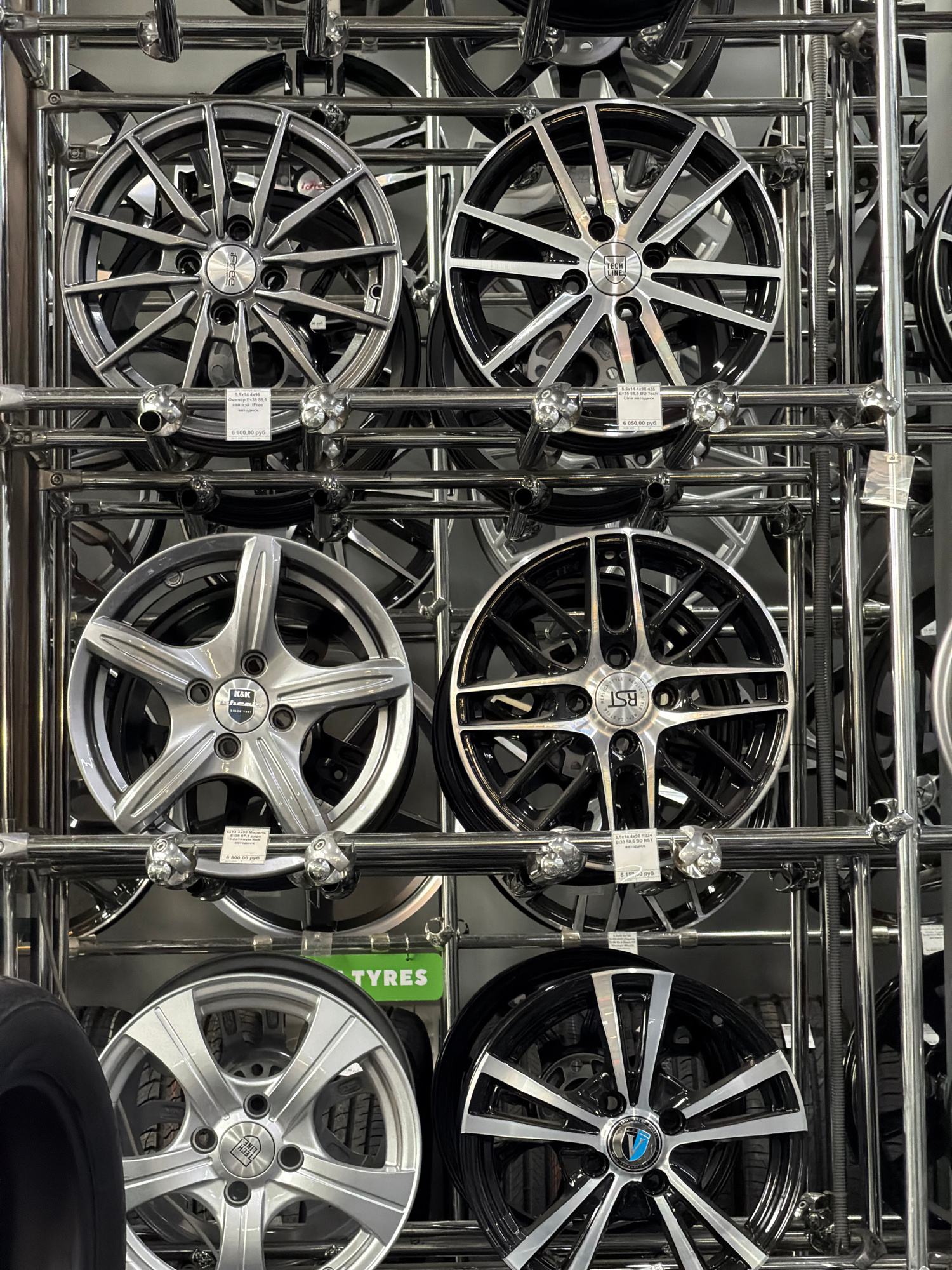 The image shows a close-up of a metal rack filled with car wheels or rims in a store. The wheels are of various designs, with silver and black finishes predominating. Some have brand logos such as "Te…read more