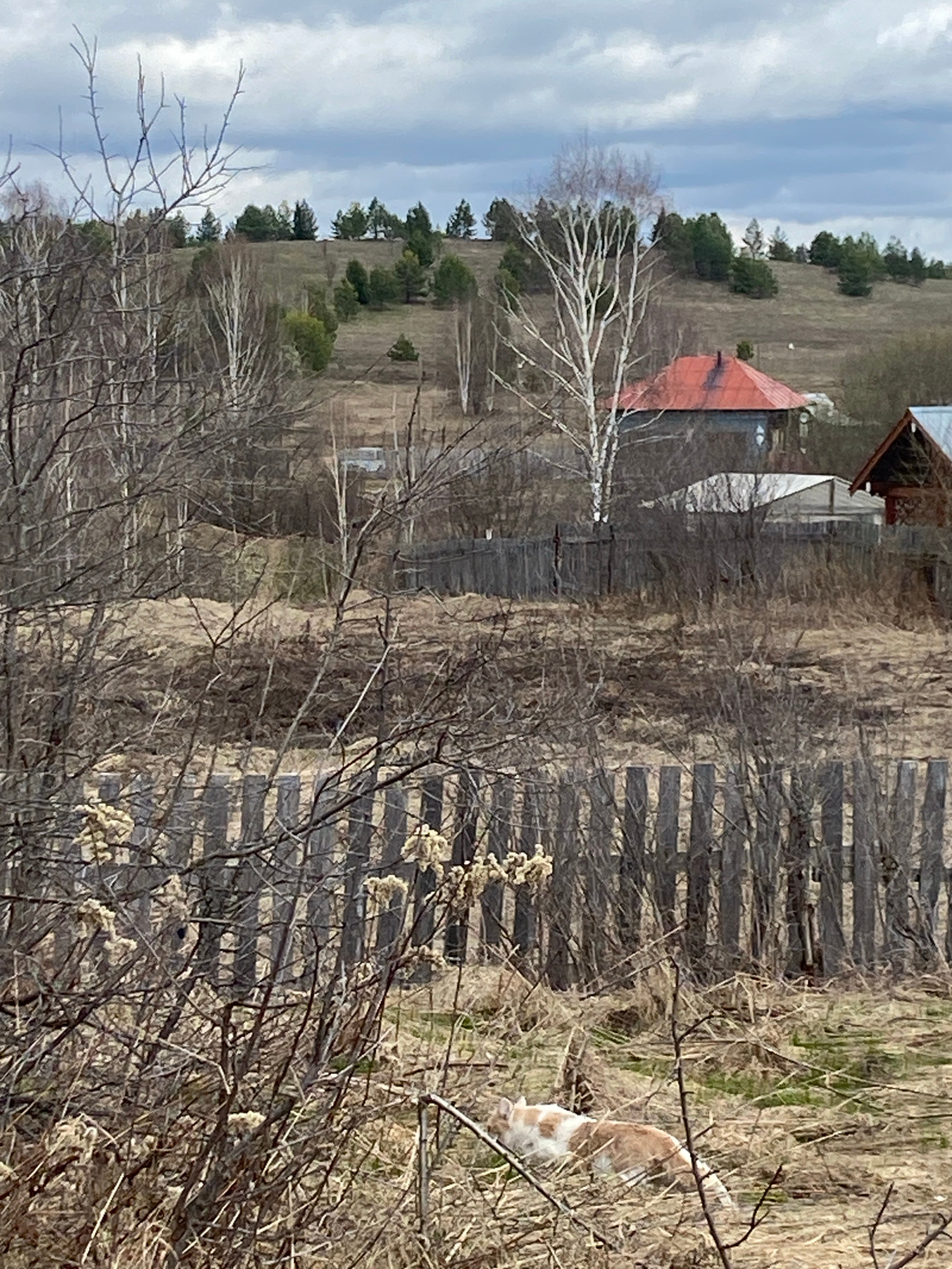 The image shows a rural landscape with a weathered wooden fence running horizontally across the midground. Behind the fence, there is a building with a red roof and adjacent structures. A bare birch tβ¦read more