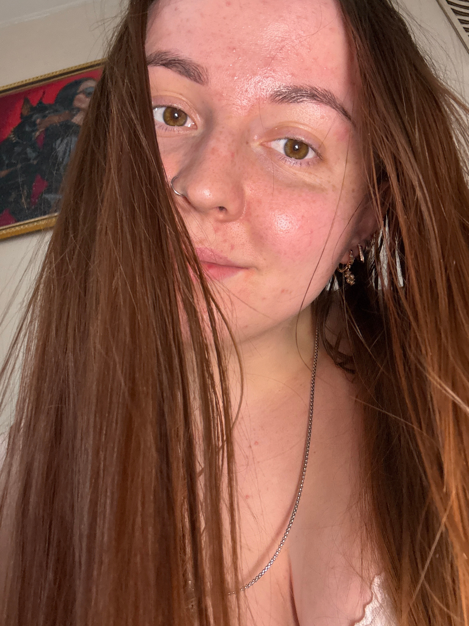 The image displays a close-up portrait of a young woman, appearing to be a selfie taken indoors in Izhevsk, Russia. Her head is tilted, and she looks directly into the camera with a neutral to slightl…read more