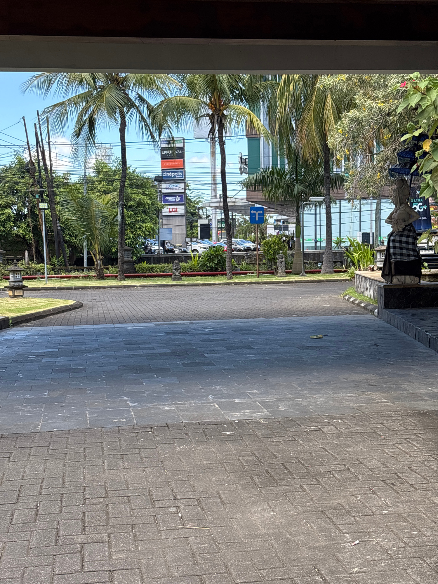 This is an outdoor daytime shot looking out from a partially enclosed space onto a paved area. Beyond the pavement, there is a strip of green grass and tropical vegetation. Palm trees line the street.…read more