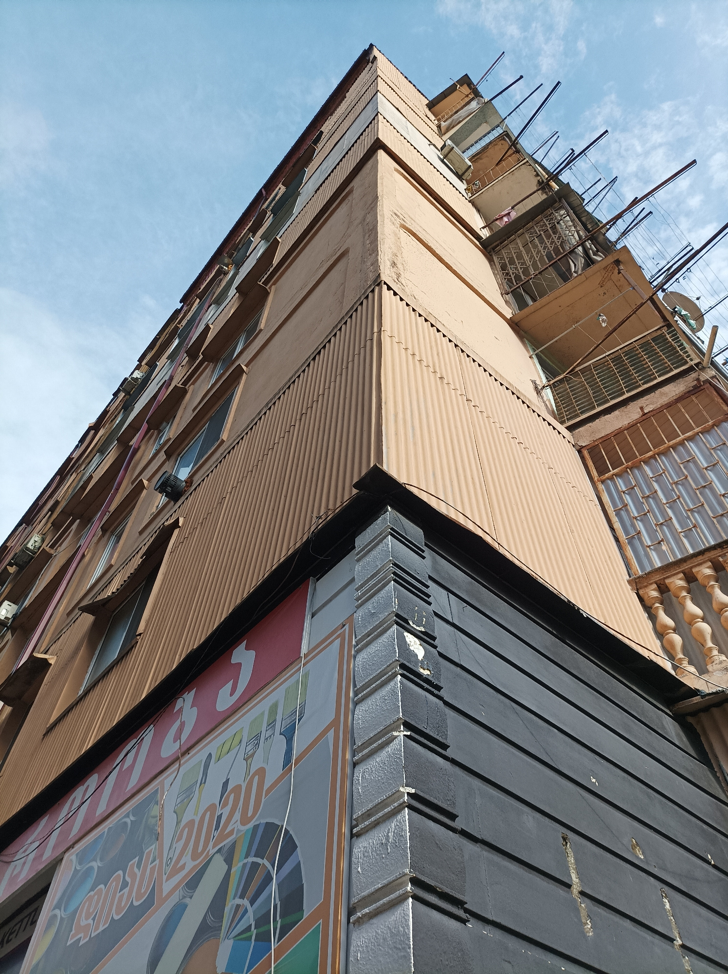 The image shows a tall, older building in Batumi, Georgia, viewed from a low angle. The building has a mix of textures: corrugated metal siding on the upper floors and dark horizontal planks on the lo…read more