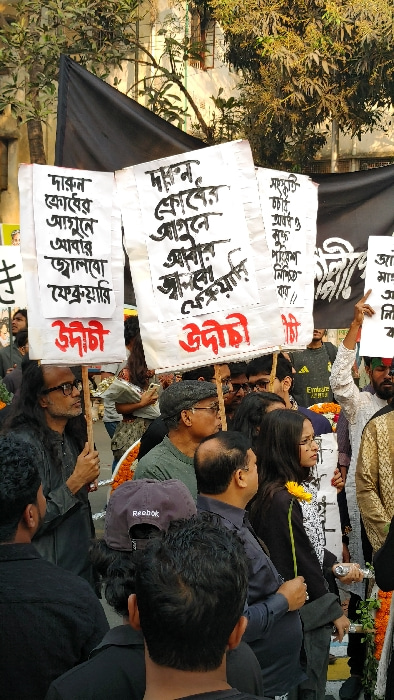 A group of people are protesting, lying on the ground. Each person is holding a sign with bold, black text in a non-English script, possibly Bengali. Some signs have the word "মুক্তি" (Mukti, meaning…read more