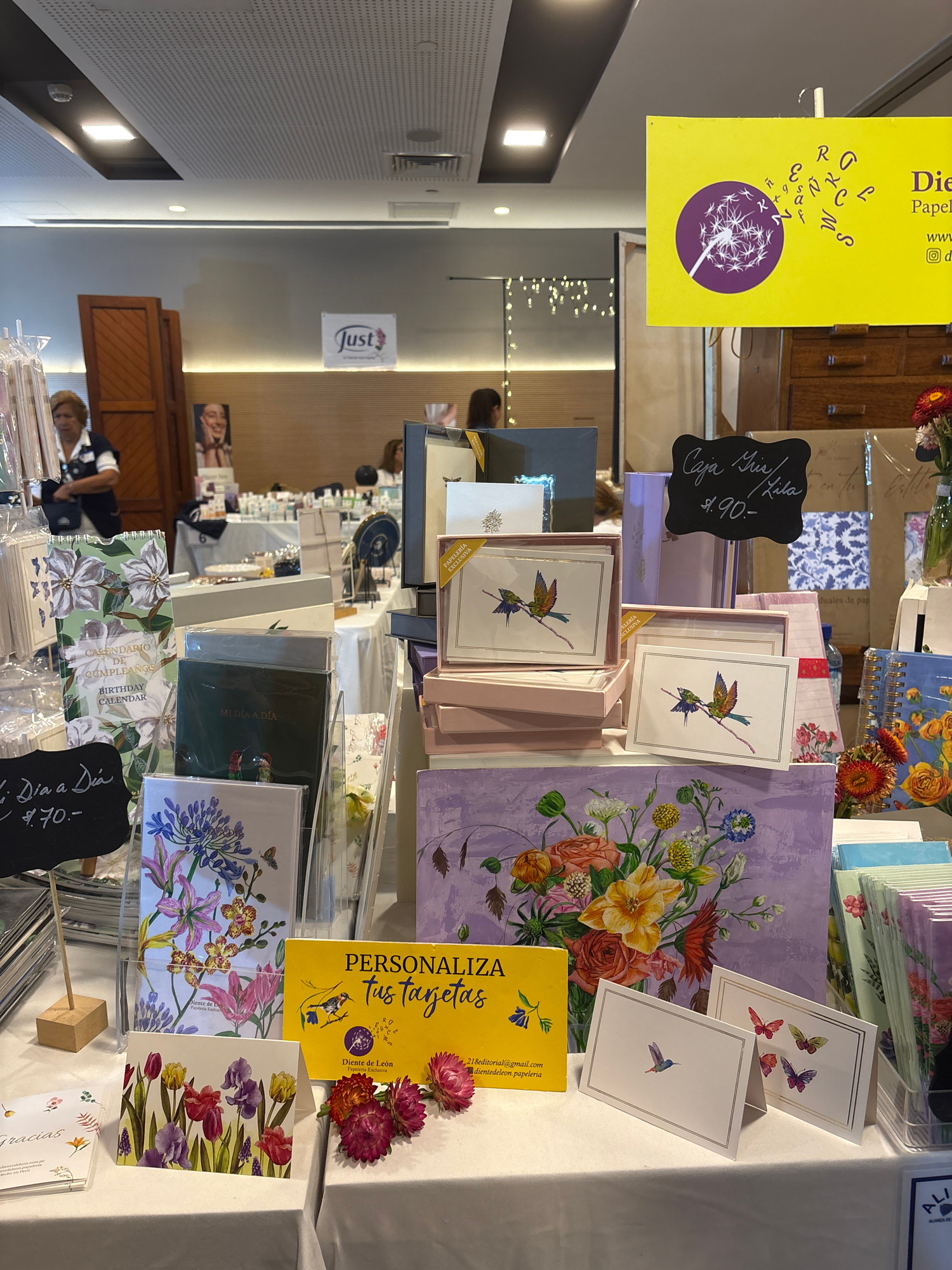 The image captures a well-lit indoor scene, likely a marketplace or fair, possibly in San Isidro, Peru. A display table covered with a white cloth is prominently featured, showcasing an array of stati…read more