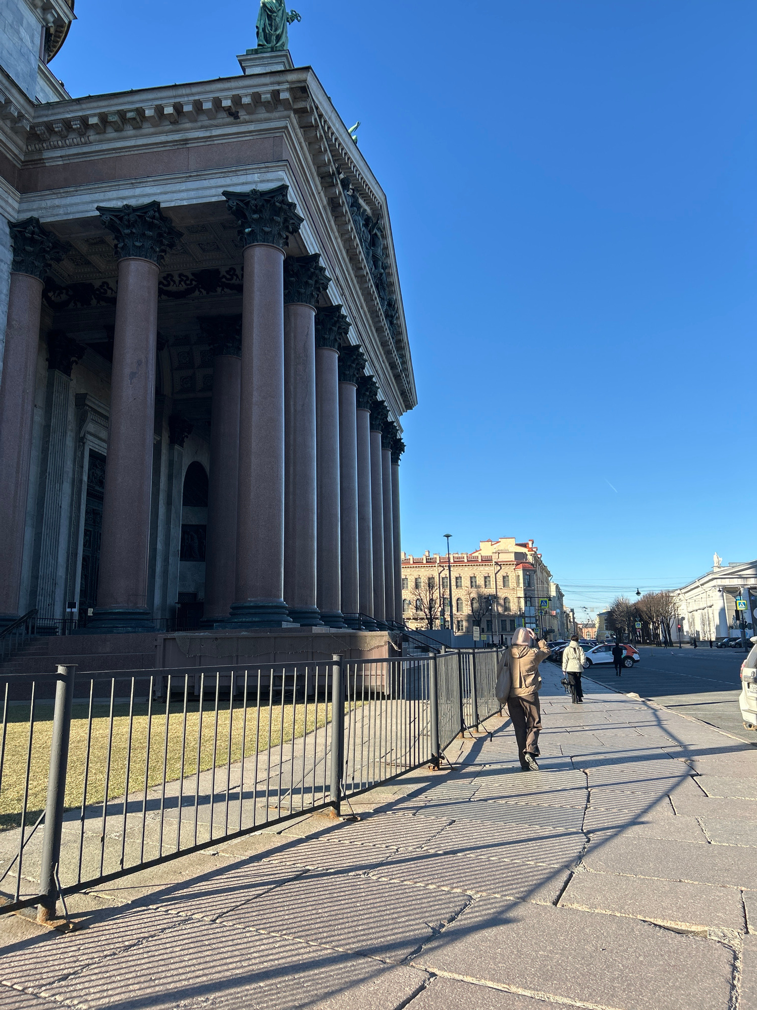 The image depicts a view of St. Isaac's Cathedral in St. Petersburg, Russia. The cathedral's imposing columns are visible on the left side of the frame, extending vertically towards the clear blue sky…read more