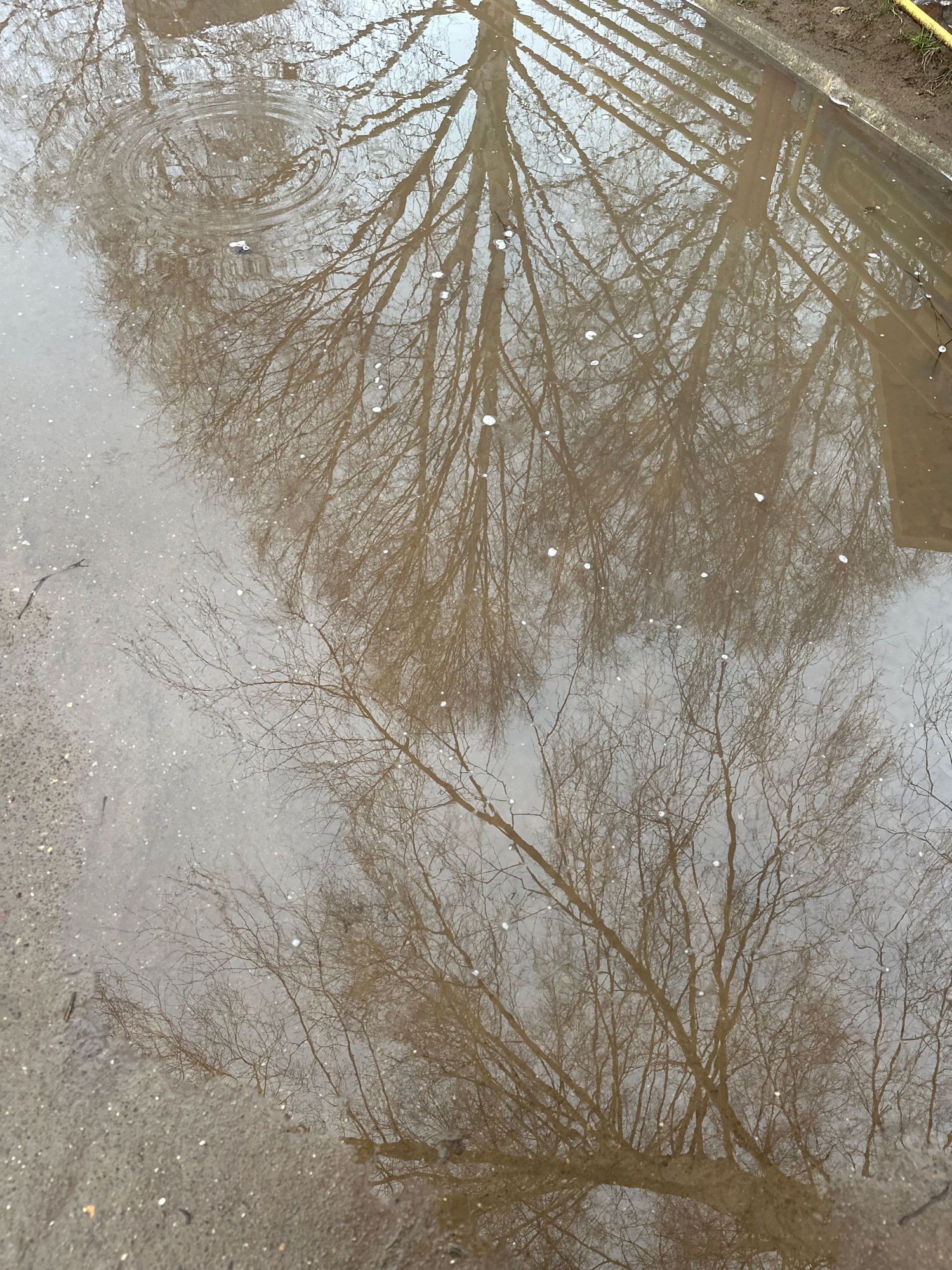 The image captures a close-up, slightly overhead view of a muddy puddle reflecting bare trees and a gray sky. The puddle occupies most of the frame, with its irregular edges visible on the left and to…read more