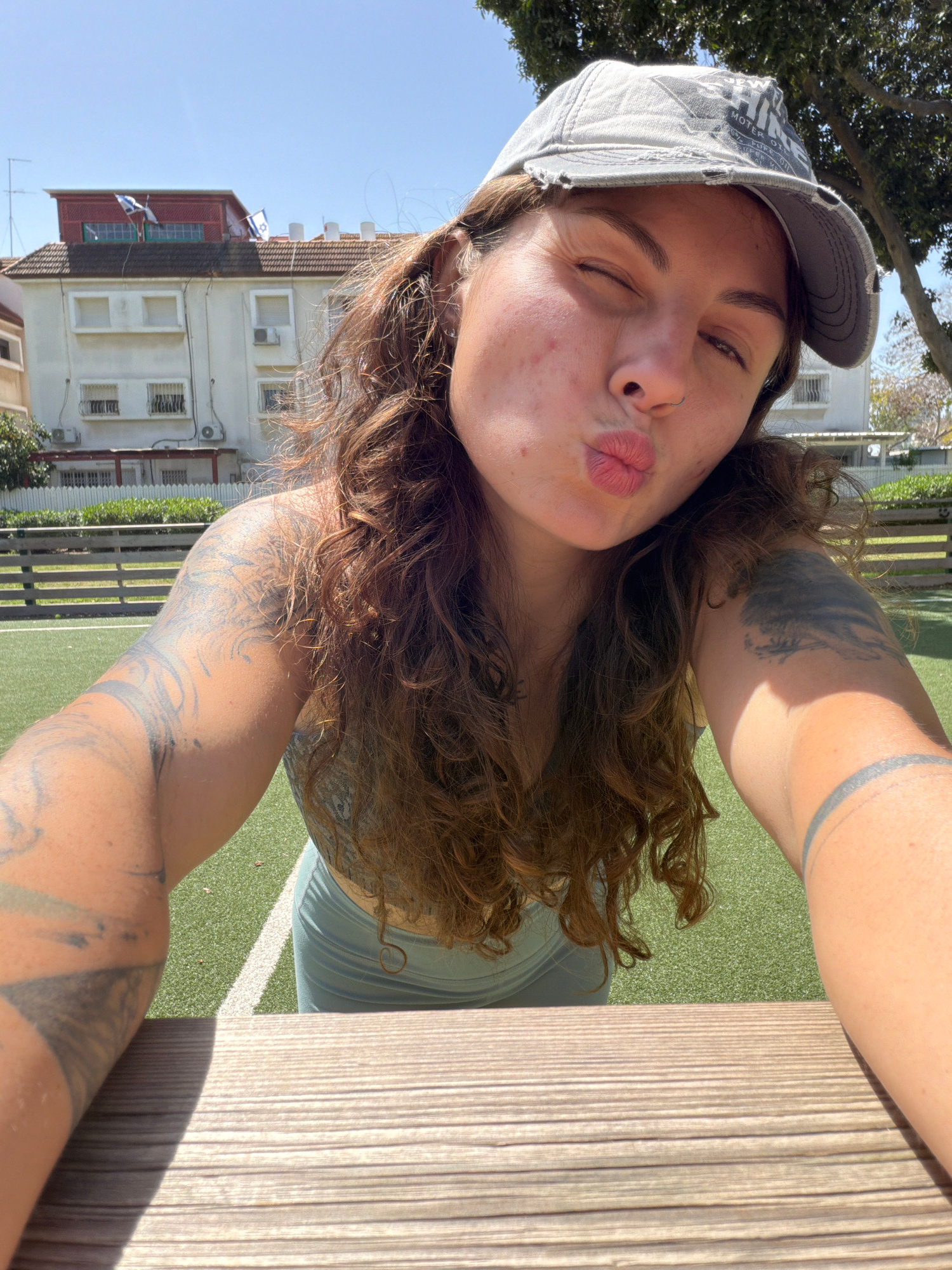 A woman is taking a selfie outdoors, near a wooden table. She is wearing a gray baseball cap and a light blue top. Her left arm and right forearm are visible and covered in tattoos. Her hair is curly and brown. She is puckering her lips and closing her eyes in a kiss gesture. In the background, there's a building with white walls, a red roof, and several windows. The flag of Israel is visible on the building. The location is Kiryat Bialik, Israel, based on the Israeli flag. There is a green lawn and a fence in the background. The sky is bright and clear. | Open Wire