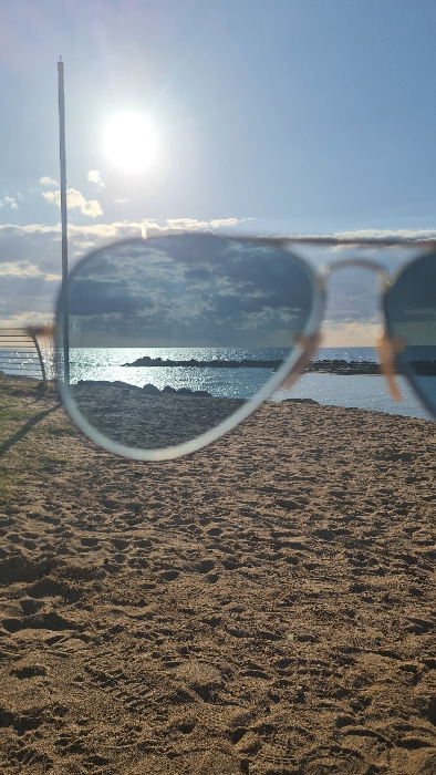 The image presents a daytime scene on a sandy beach in Nahariyya, Israel. The primary subject is a pair of gold-rimmed, aviator-style sunglasses positioned in the immediate foreground, partially obscu…read more