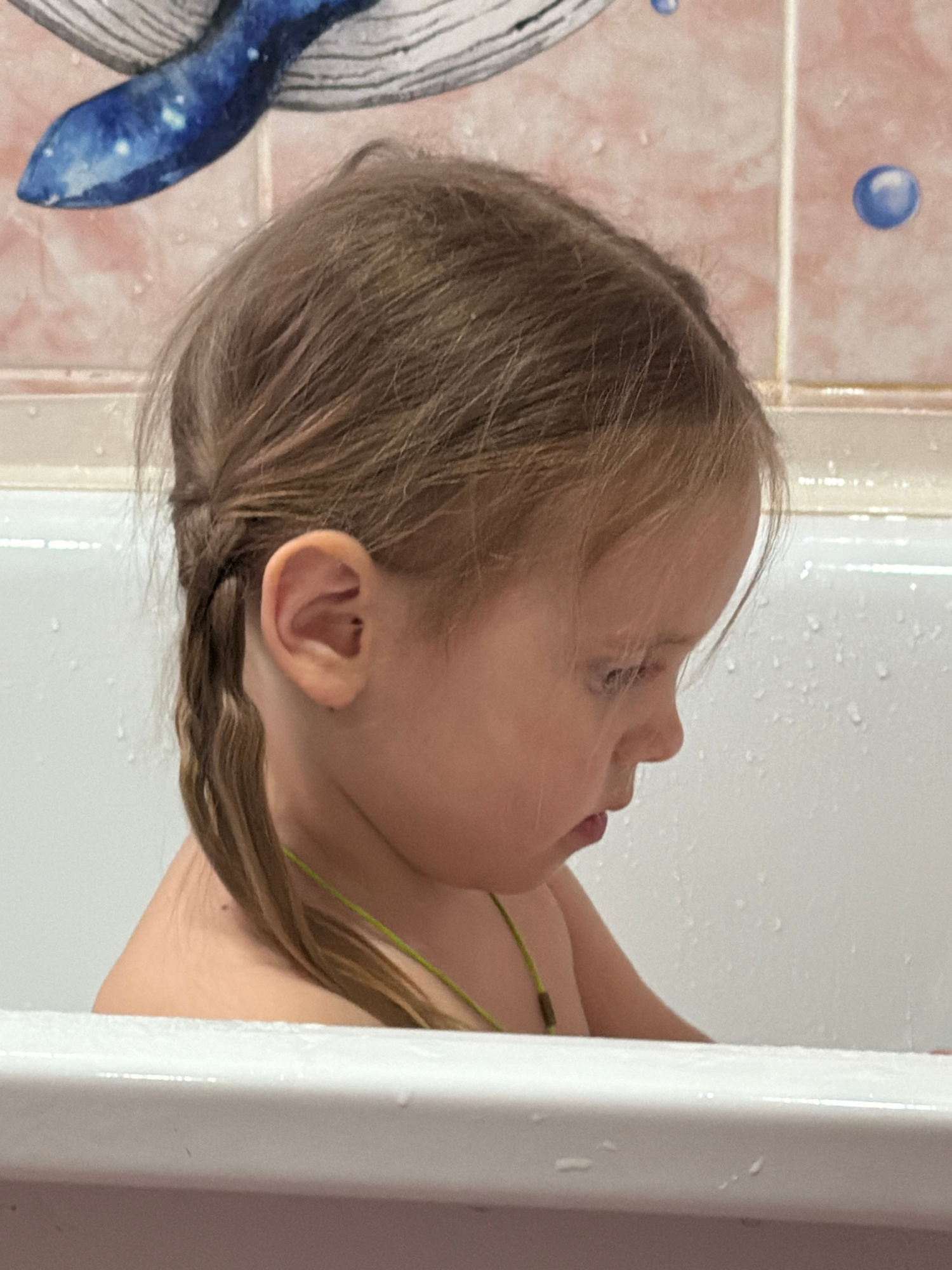 A young child is in a bathtub, presumably in a bathroom with tiled walls and a whale-themed decoration. The child has fair skin and light brown hair. The bathroom could be located in the city of Chaik…read more