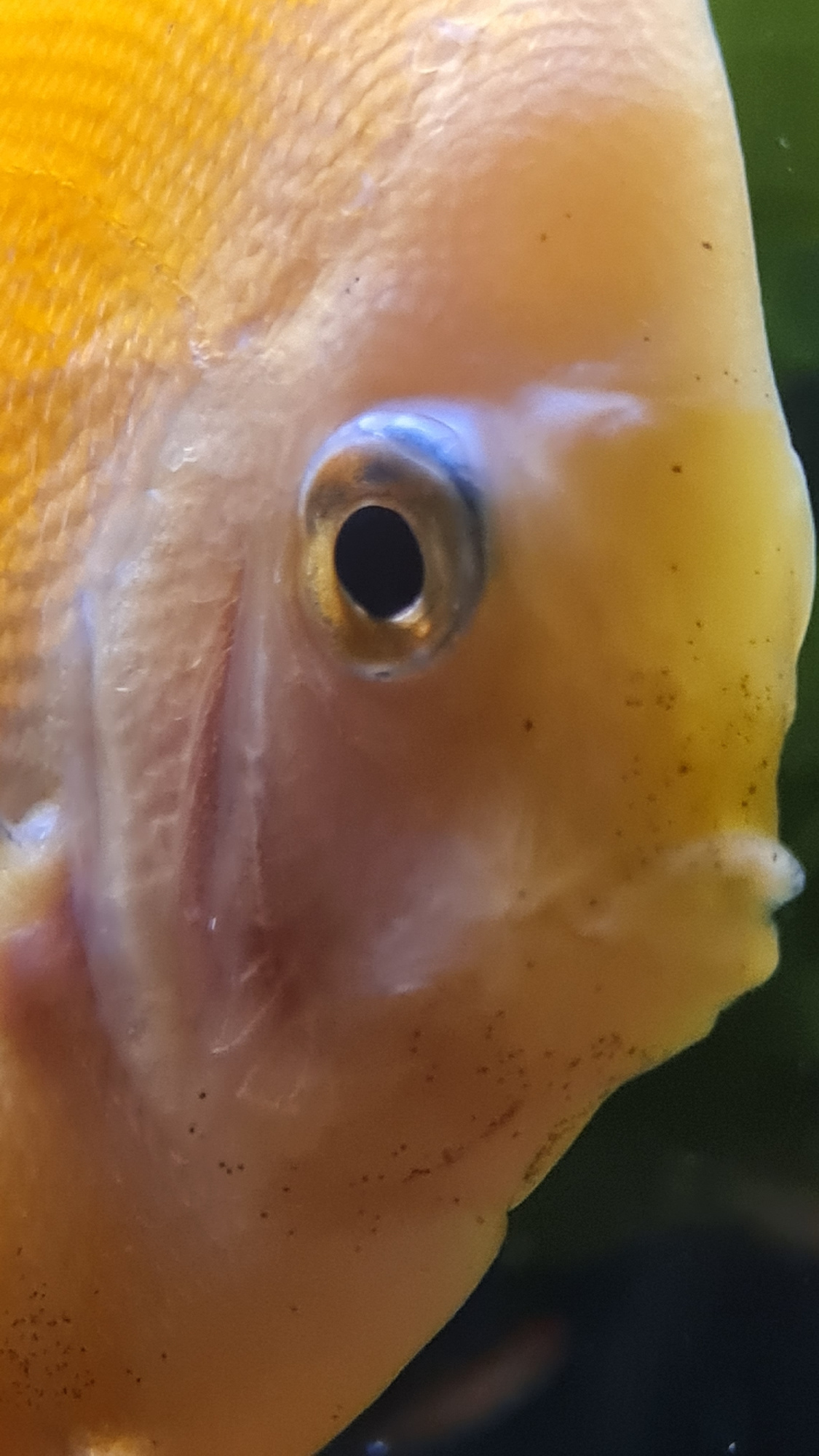 A close-up, horizontal shot focuses on the head and upper body of a bright yellow or orange fish, likely an ornamental species, within an aquarium environment. The fish's left eye is prominent near th…read more