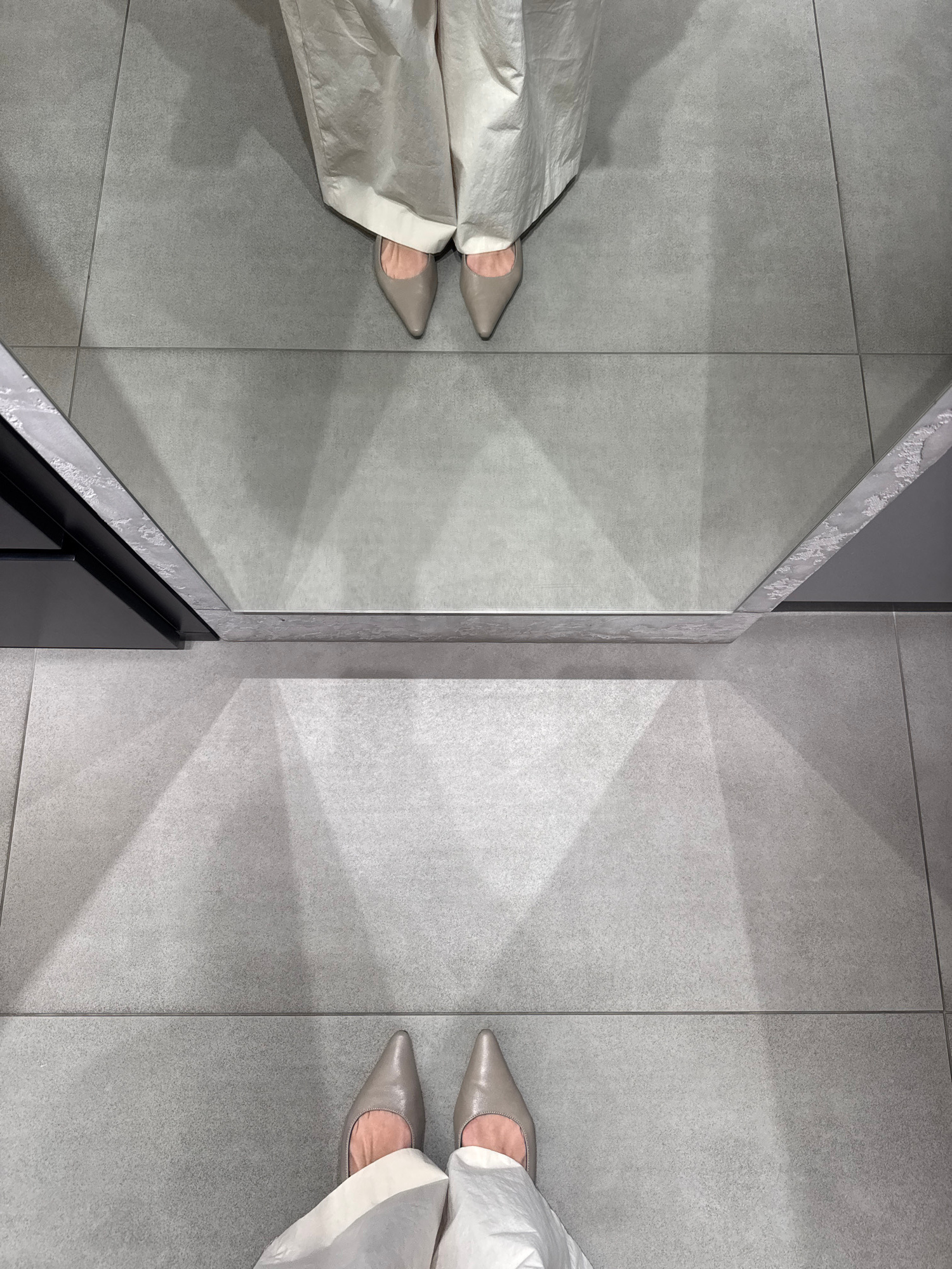 The image shows a person standing on gray tiled flooring, wearing light-colored trousers and gray pointed-toe shoes. The person's reflection is visible in a mirror located to the left of the person. T…read more