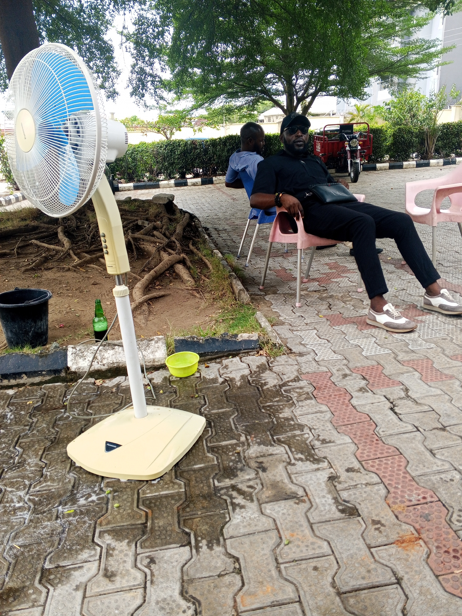 The image shows an outdoor scene in Lokoja, Nigeria. A Black man is seated on a pink plastic chair, wearing all black clothing and sunglasses. Another man, partially visible, is seated on a blue plast…read more