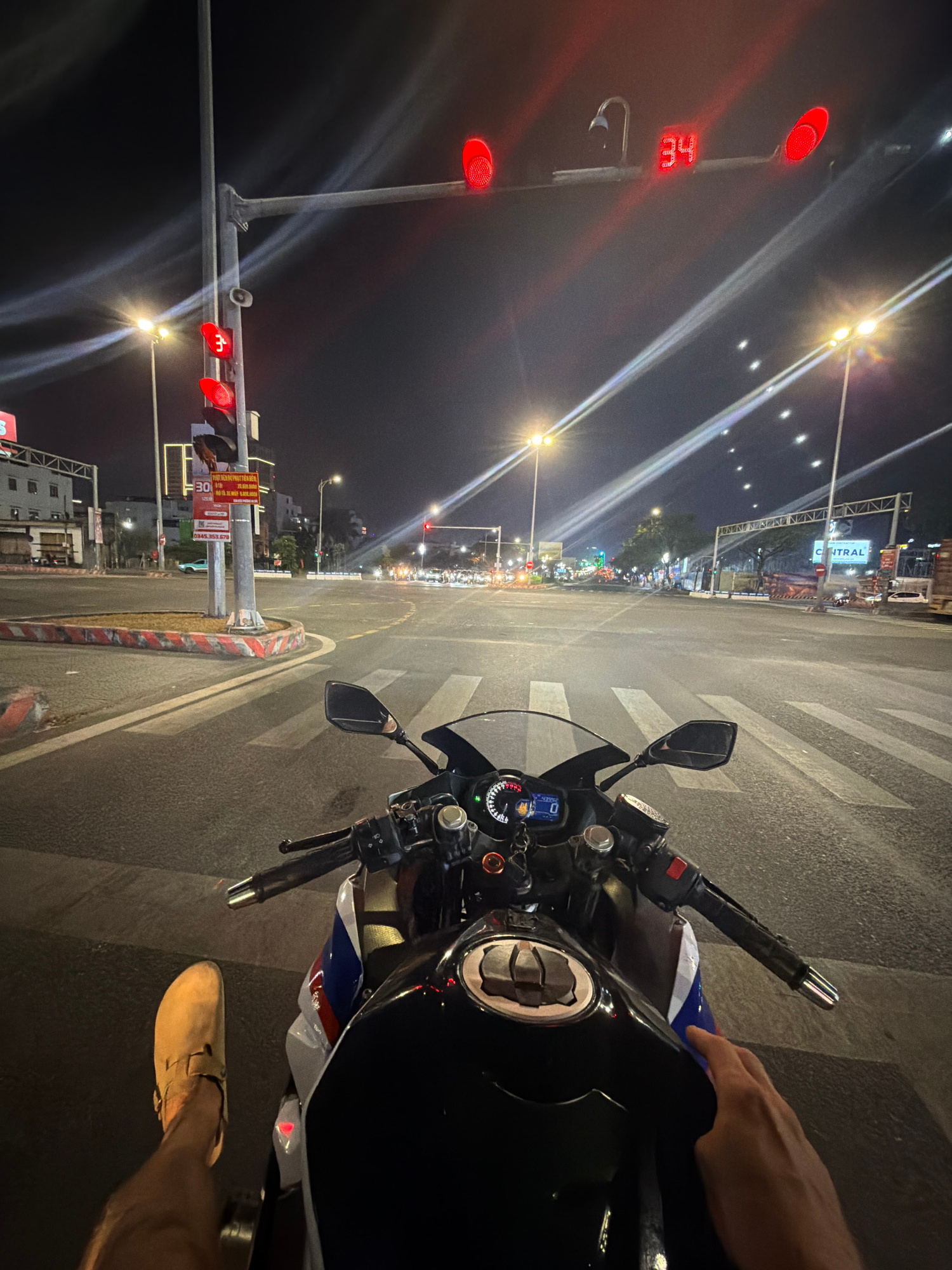 View from the seat of a motorcycle, facing towards the "Central" shopping mall in Đà Nẵng, Vietnam, at night. The motorcycle's handlebars, mirrors, dashboard, fuel tank, and the rider's hands are visi…read more