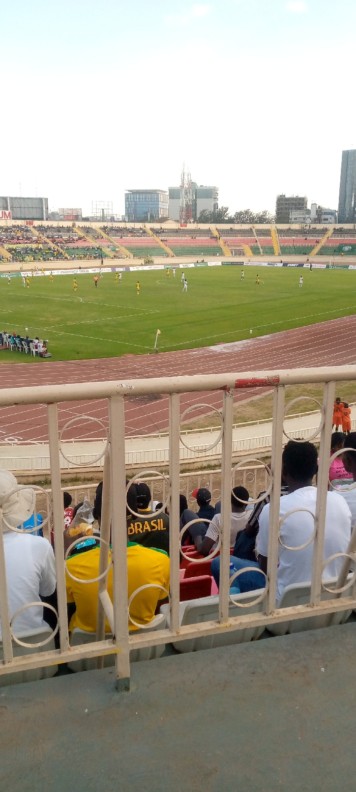 From behind a stadium railing, a soccer game unfolds on a green field surrounded by stands filled with spectators. Players in yellow and white jerseys are visible on the field. In the foreground, several individuals sit in the stands. One man wears a yellow Brazil jersey. Beyond the stadium, buildings rise in the distance under a clear sky. | Open Wire
