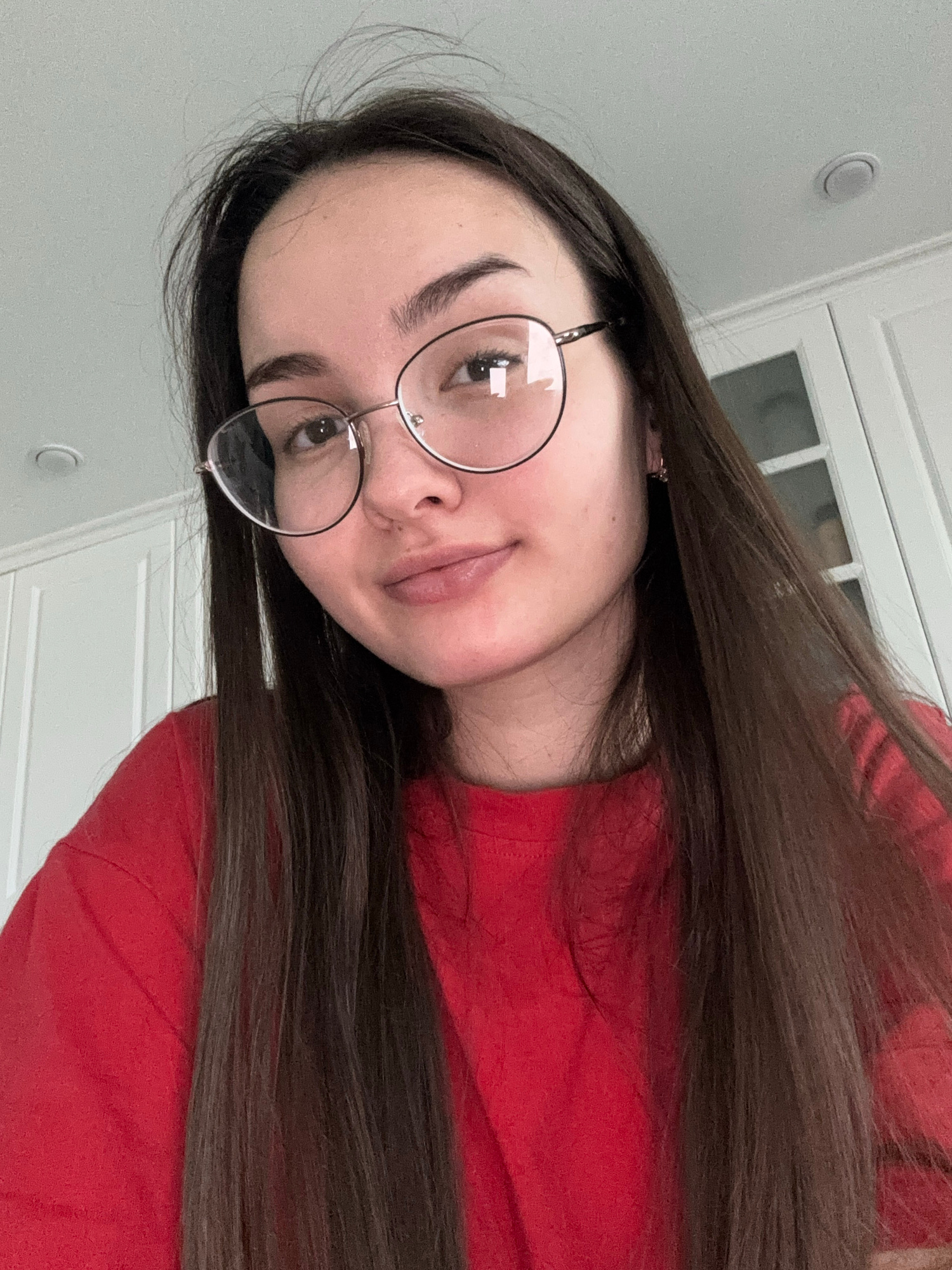 A young woman with long brown hair is wearing round, wire-framed glasses and a red shirt. The background is a plain white wall and a white paneled door. The location is not discernible from the image.