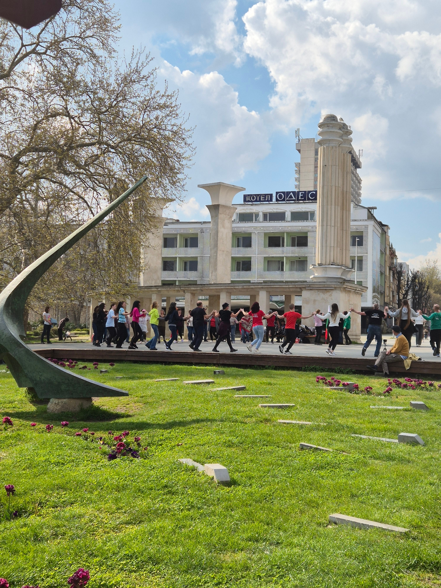 Here is a detailed description of the image: The image shows an outdoor scene in Varna, Bulgaria, featuring a green lawn with rows of small, rectangular headstones or markers. A group of people, form…read more