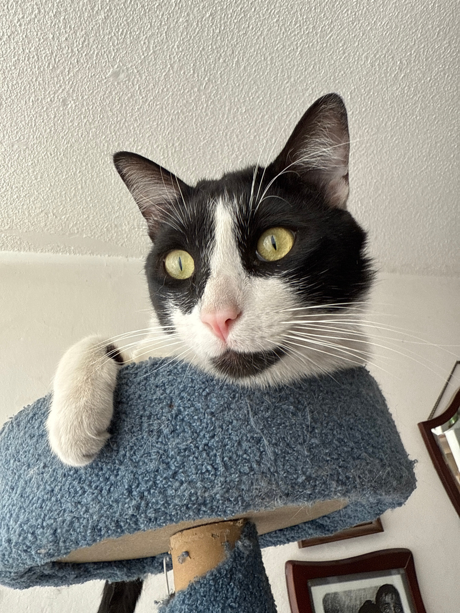 A black and white cat is peering down from a blue, carpeted cat tree. The cat has yellow-green eyes, a pink nose, and a single white paw is visible. A white wall is on the left, and above the cat tree…read more