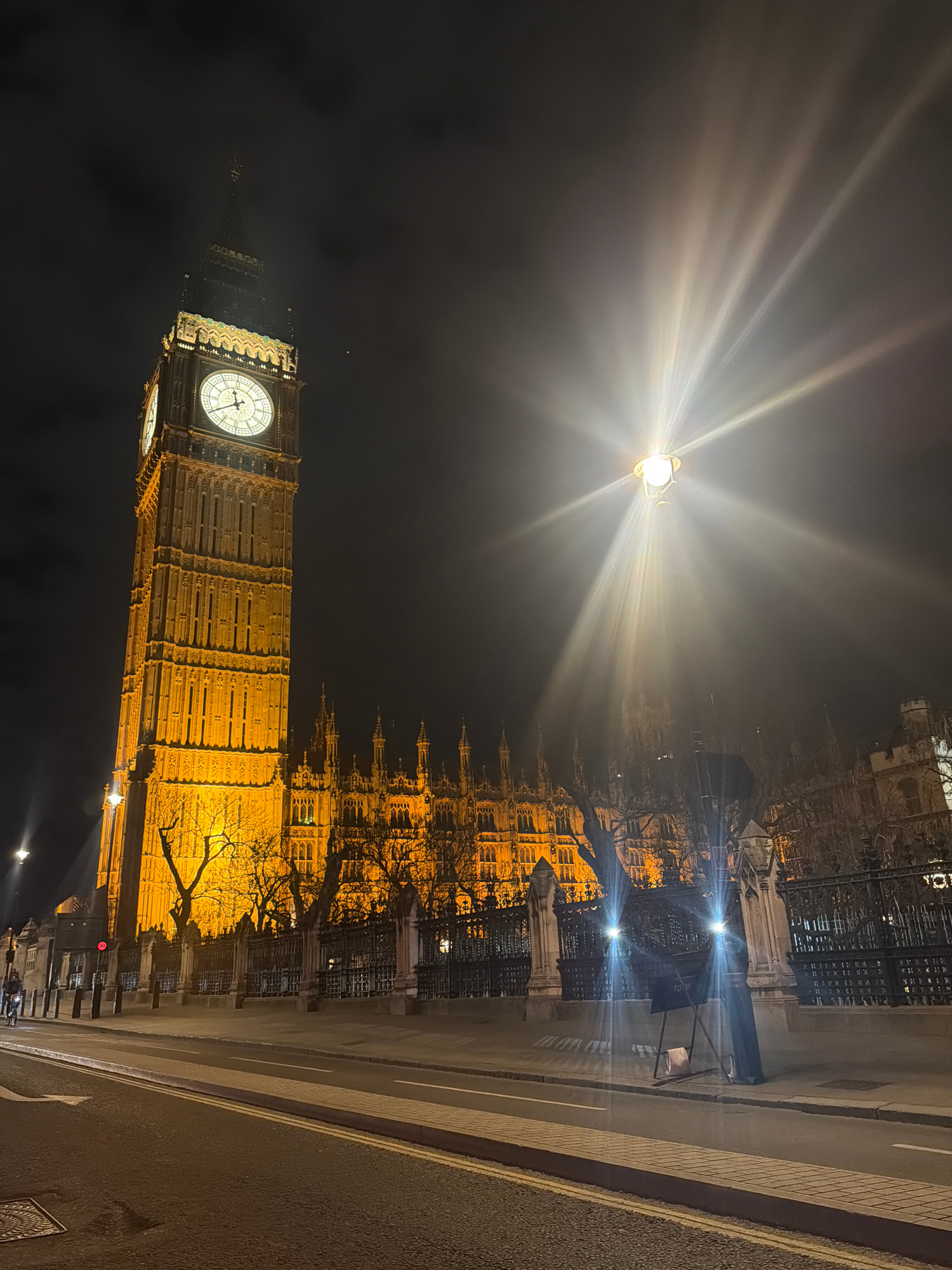 This photograph captures a night scene in London, United Kingdom, featuring the illuminated Elizabeth Tower (housing Big Ben) and the Houses of Parliament. The tower's clock face is visible. A street…read more