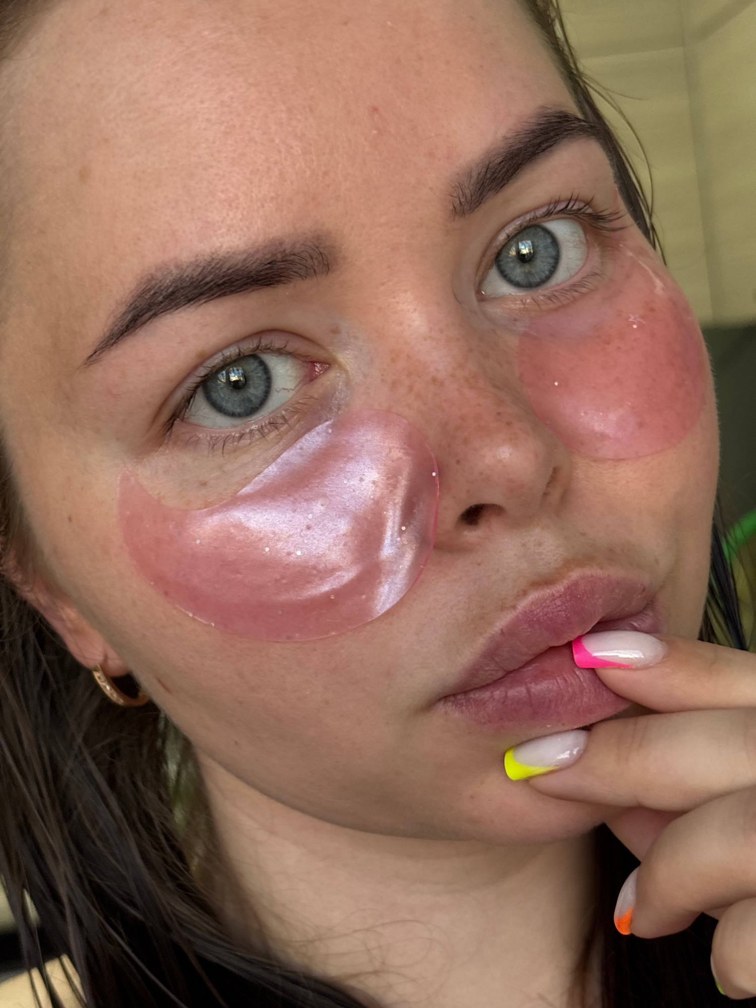 A close-up, high-angle portrait captures a young woman engaged in a skincare routine, likely indoors in Izhevsk, Russia. Her face is angled upwards and slightly to the side, with her striking blue-gre…read more