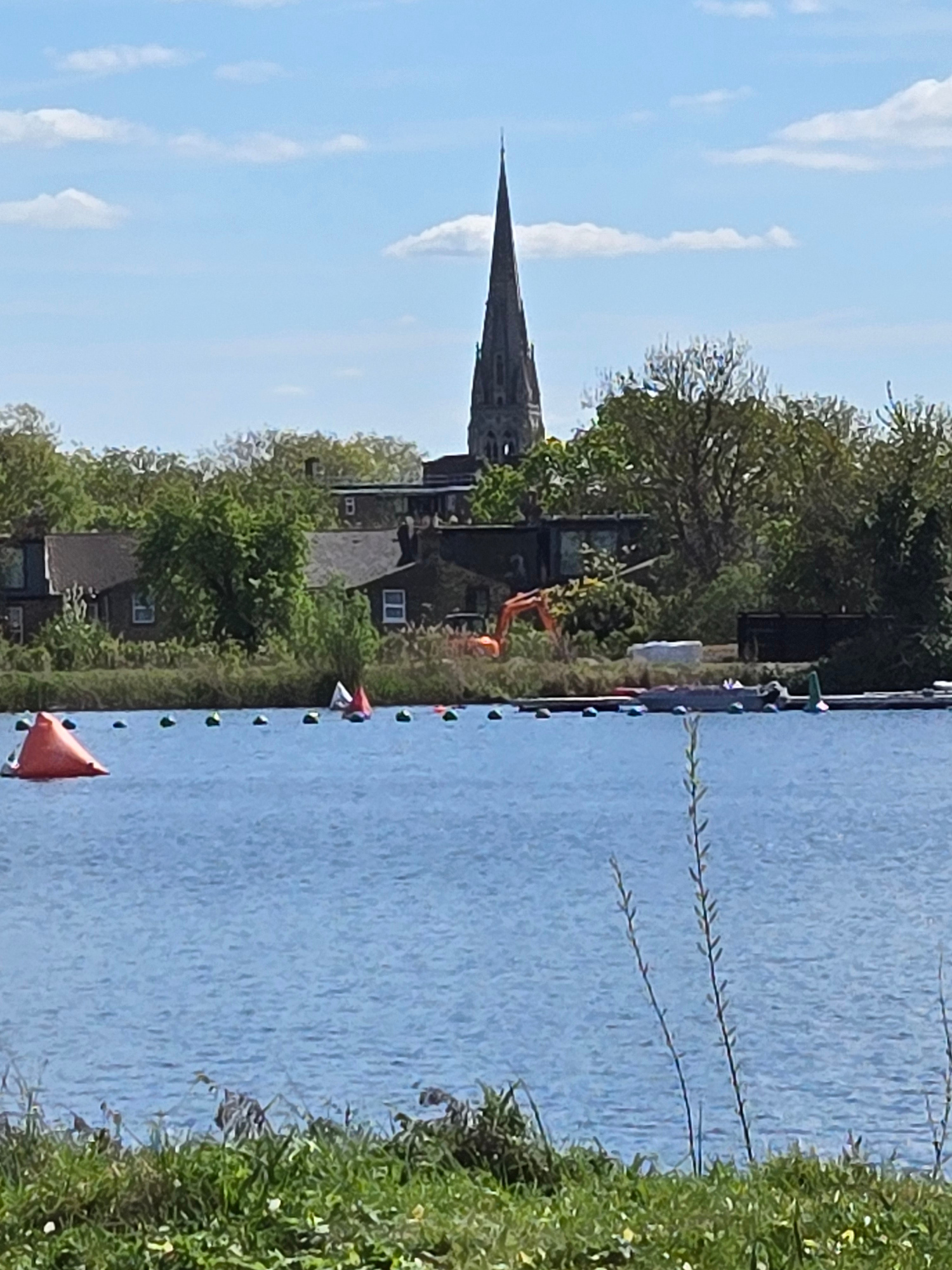The image depicts a view across a body of water towards a waterside with vegetation and buildings. Notably, there's a prominent church spire in the background, a feature often seen in urban and histor…read more