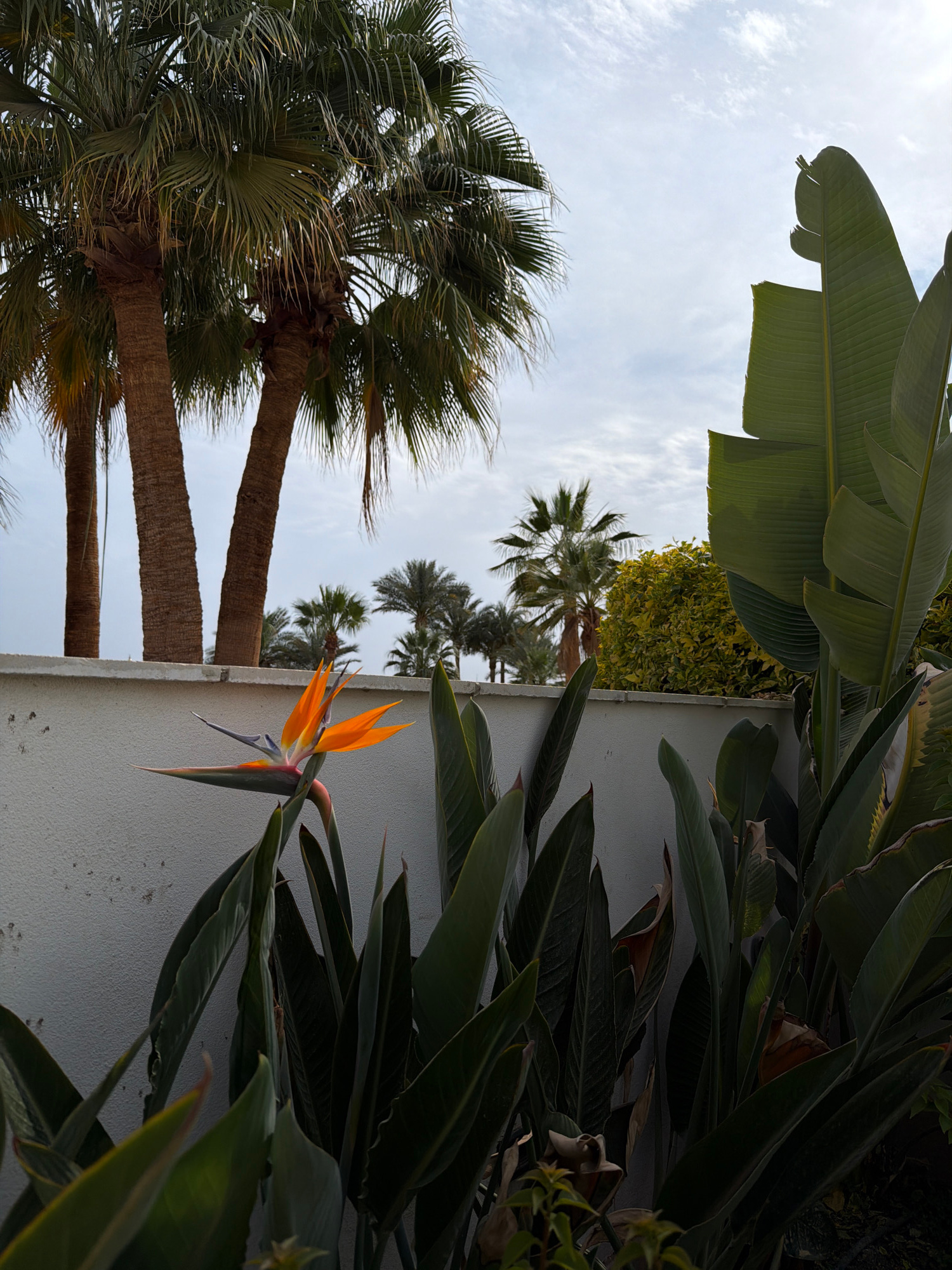 The image depicts a scene in Sharm El Sheikh, Egypt. In the foreground, a Bird of Paradise flower blooms against a white wall. Various palm trees and tropical plants surround the wall and flower, incl…read more