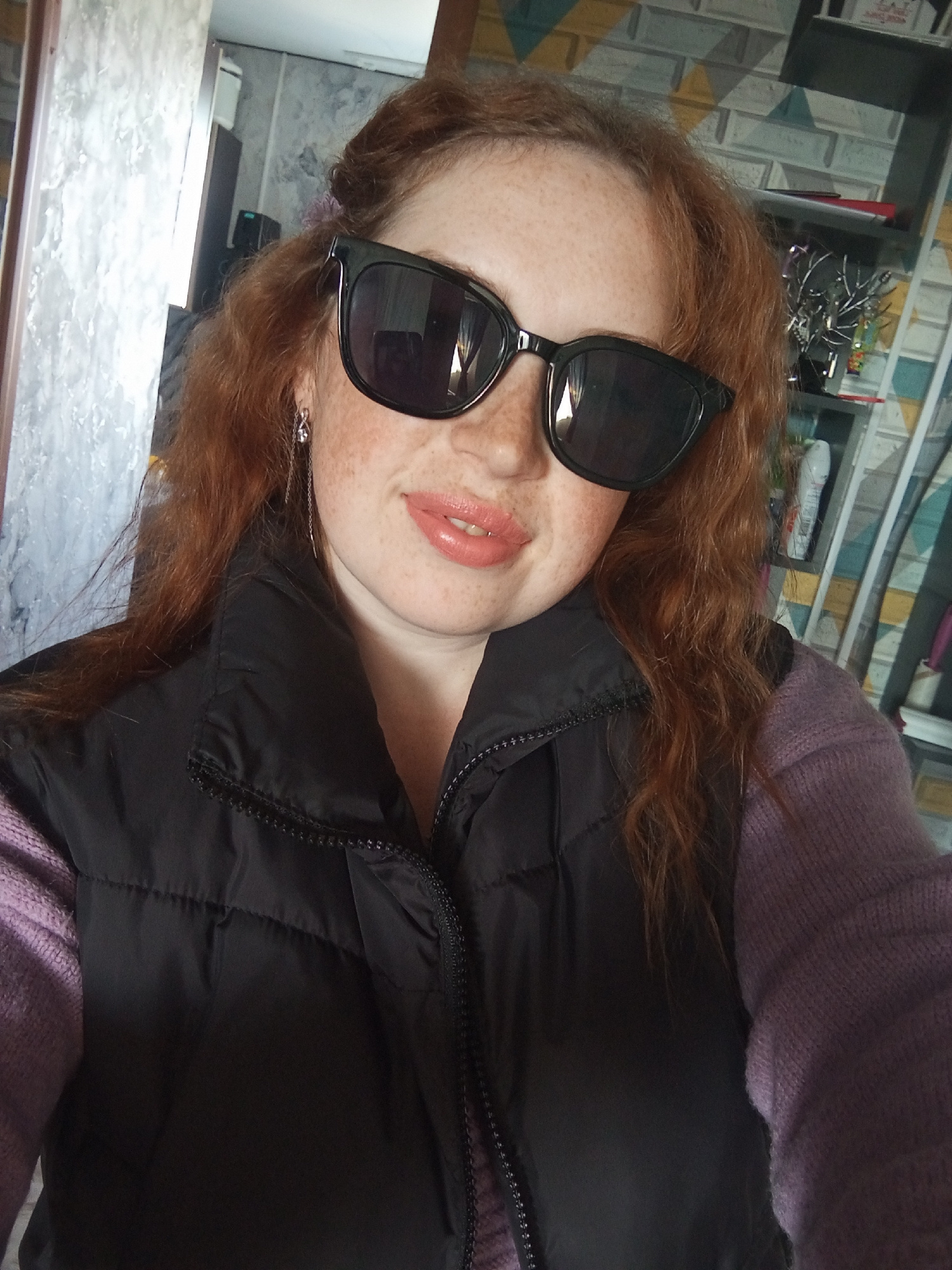 A red-haired woman with freckles is wearing sunglasses and a black puffy vest over a light purple sweater, posing for a selfie in a bathroom, likely located in Yurgamysh, Russia. Behind her is a wall…read more