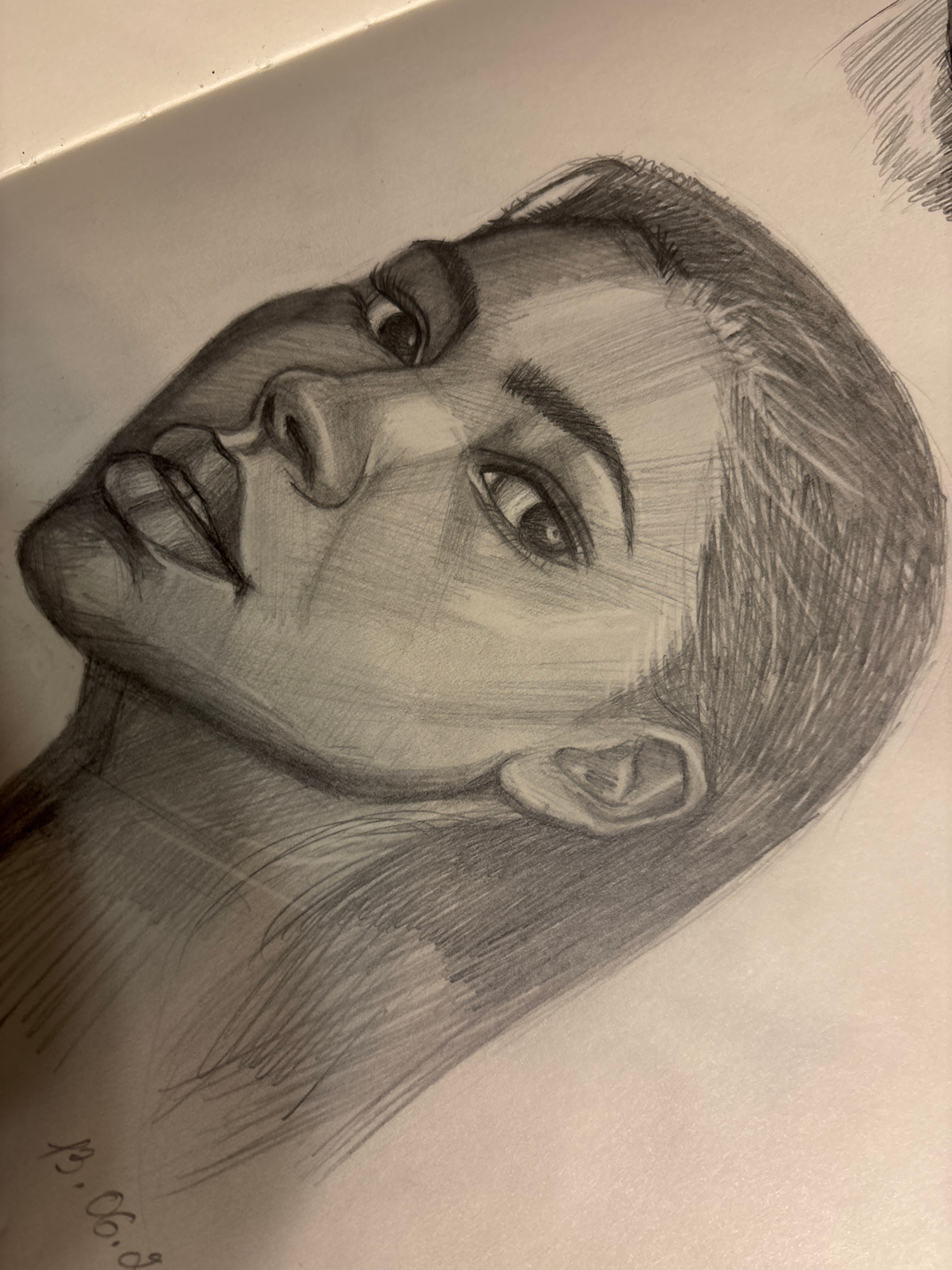 A sketch of a woman's face, turned slightly toward the viewer, is depicted on a white page, presumably in a sketchbook. The drawing is done in pencil, with varying shades of gray suggesting light and…read more