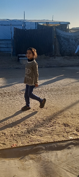 A young girl, approximately 6-10 years old, with curly brown hair, walks from right to left across an uneven dirt and sand path. She wears a light brown knit sweater with "HENA" or "HYNA" and two inte…read more