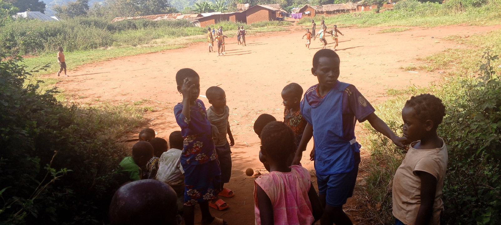 The image depicts a group of children in Ngalula, Democratic Republic of the Congo. In the foreground, several children are gathered near vegetation. One wears a blue floral-patterned dress, and anoth…read more