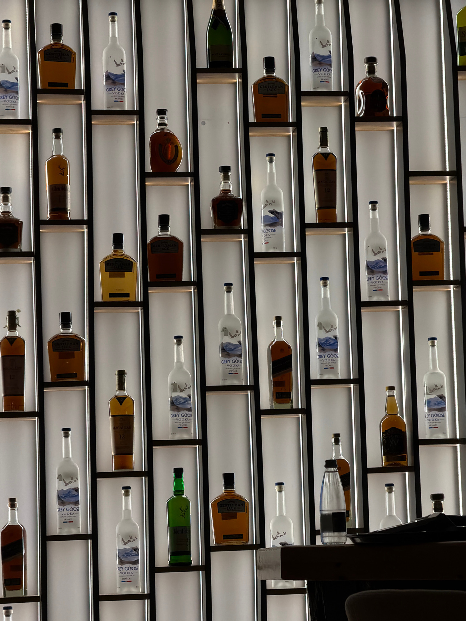 A brightly lit display case is filled with numerous bottles of liquor. Most of the bottles are Grey Goose Vodka. Other brands include Gentleman Jack, Glenfiddich, and Macallan. The bottles are placed…read more