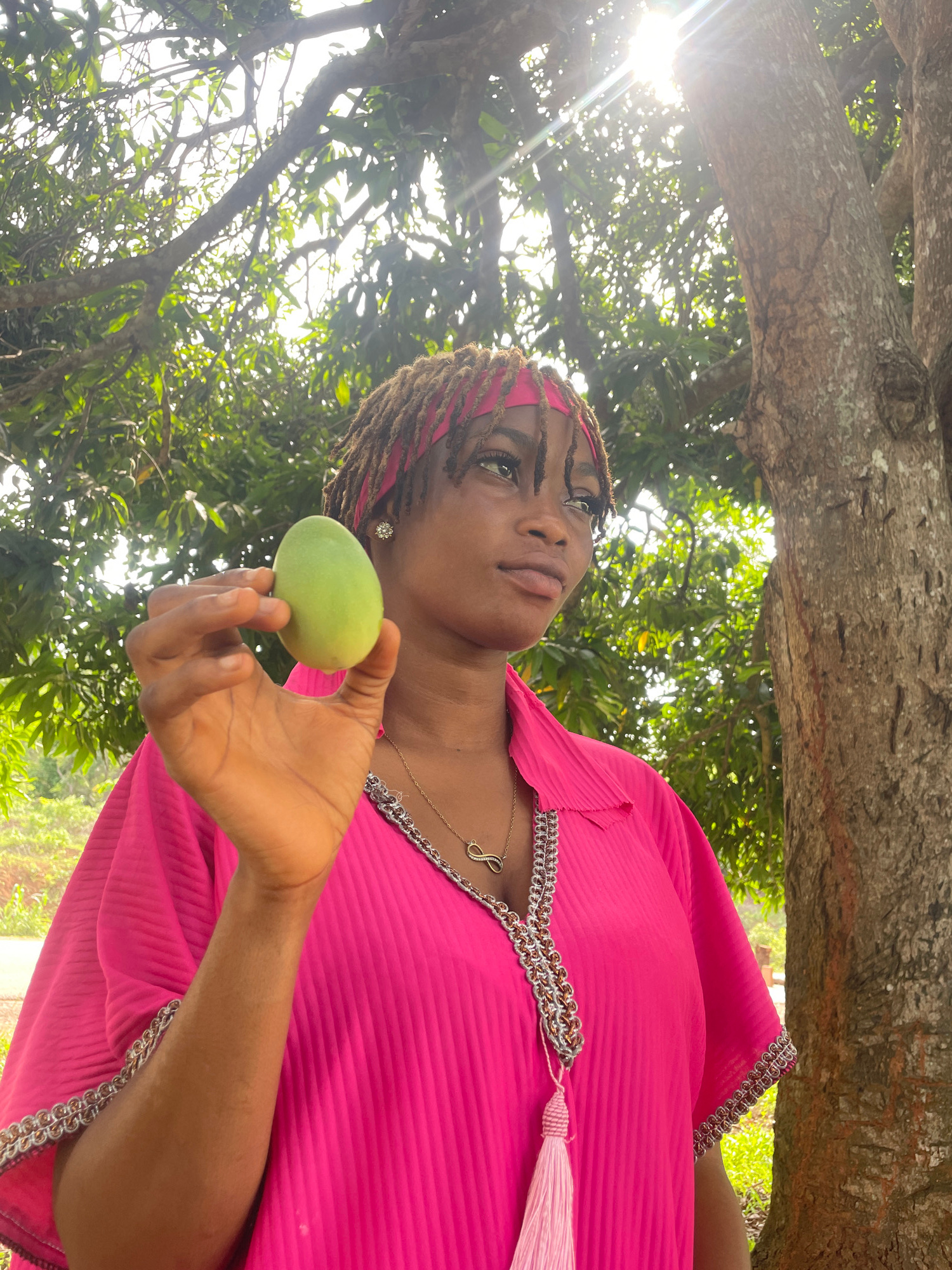 In a vertically oriented outdoor shot taken in Ogbe, Nigeria, a young woman is depicted under the dense canopy of a large tree. She has dreadlocks pulled back by a pink headband and wears a bright pin…read more
