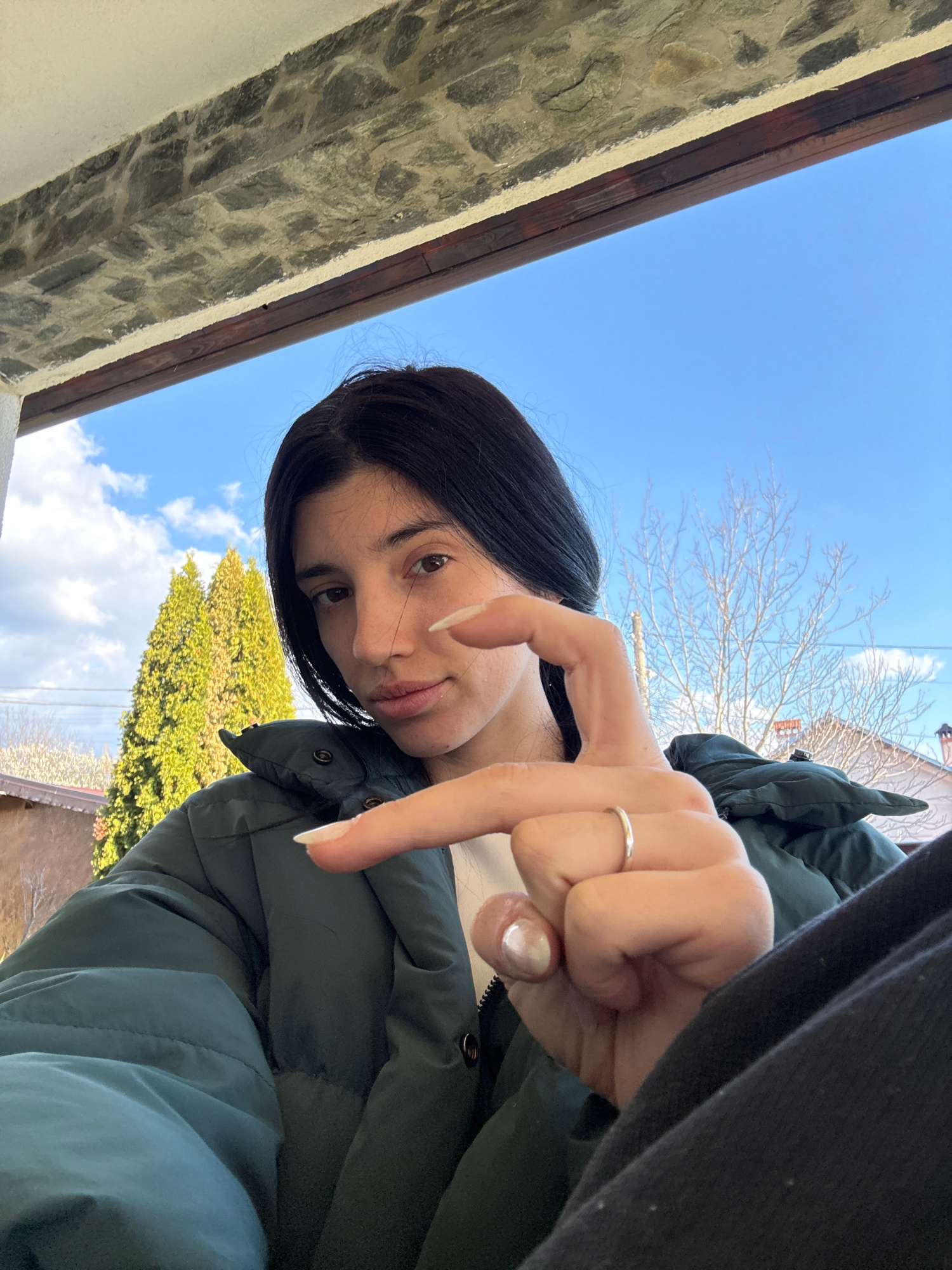 A young woman with dark hair is in the foreground. She wears a dark puffer jacket and a ring on her ring finger, and she is holding up her hand. She appears to be outside. In the background, there isβ¦read more