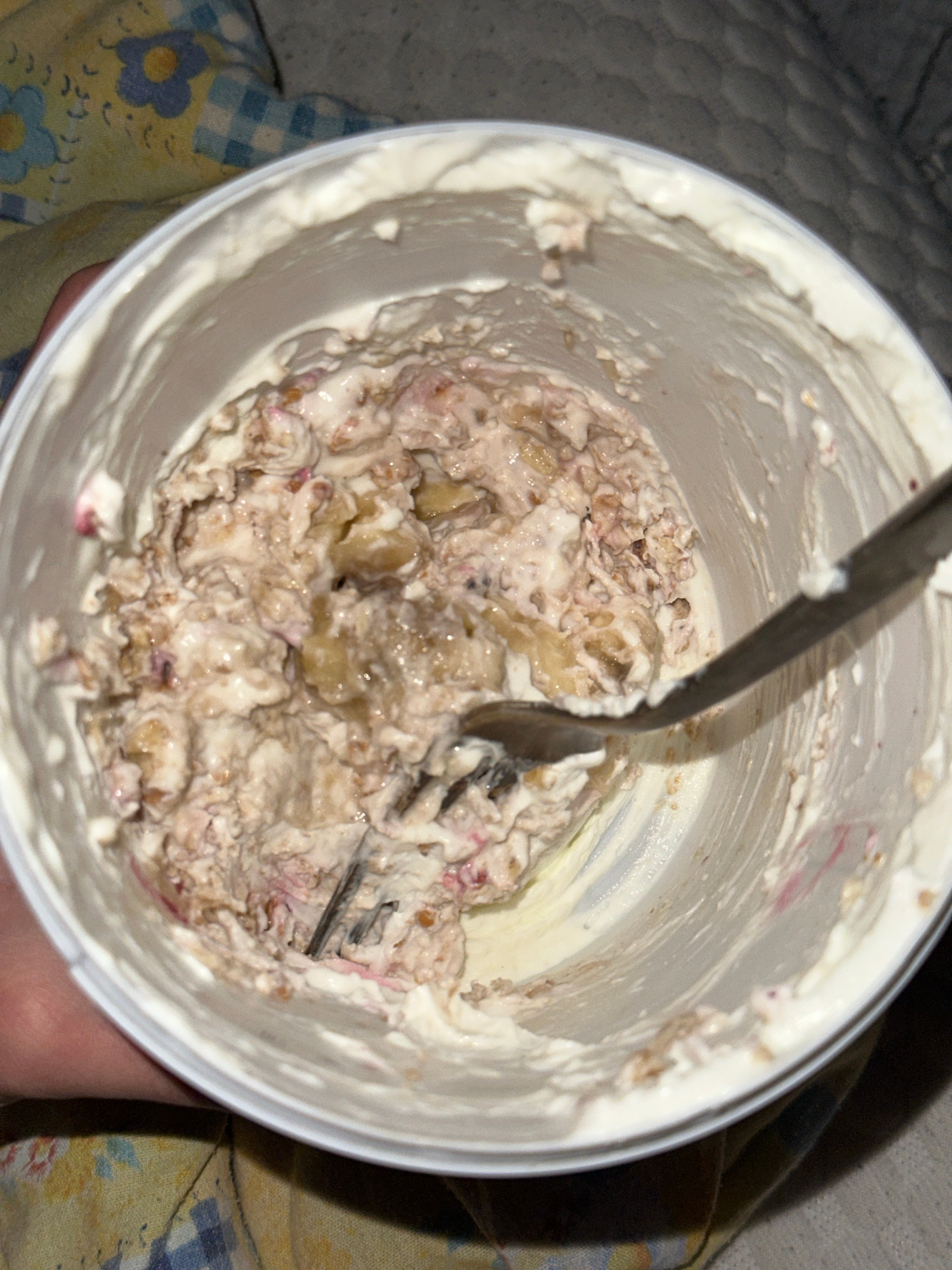 A close-up, overhead shot shows the inside of a white, circular container, likely plastic. The container is filled with a mixed food substance; its components appear to include cream, potentially yogu…read more