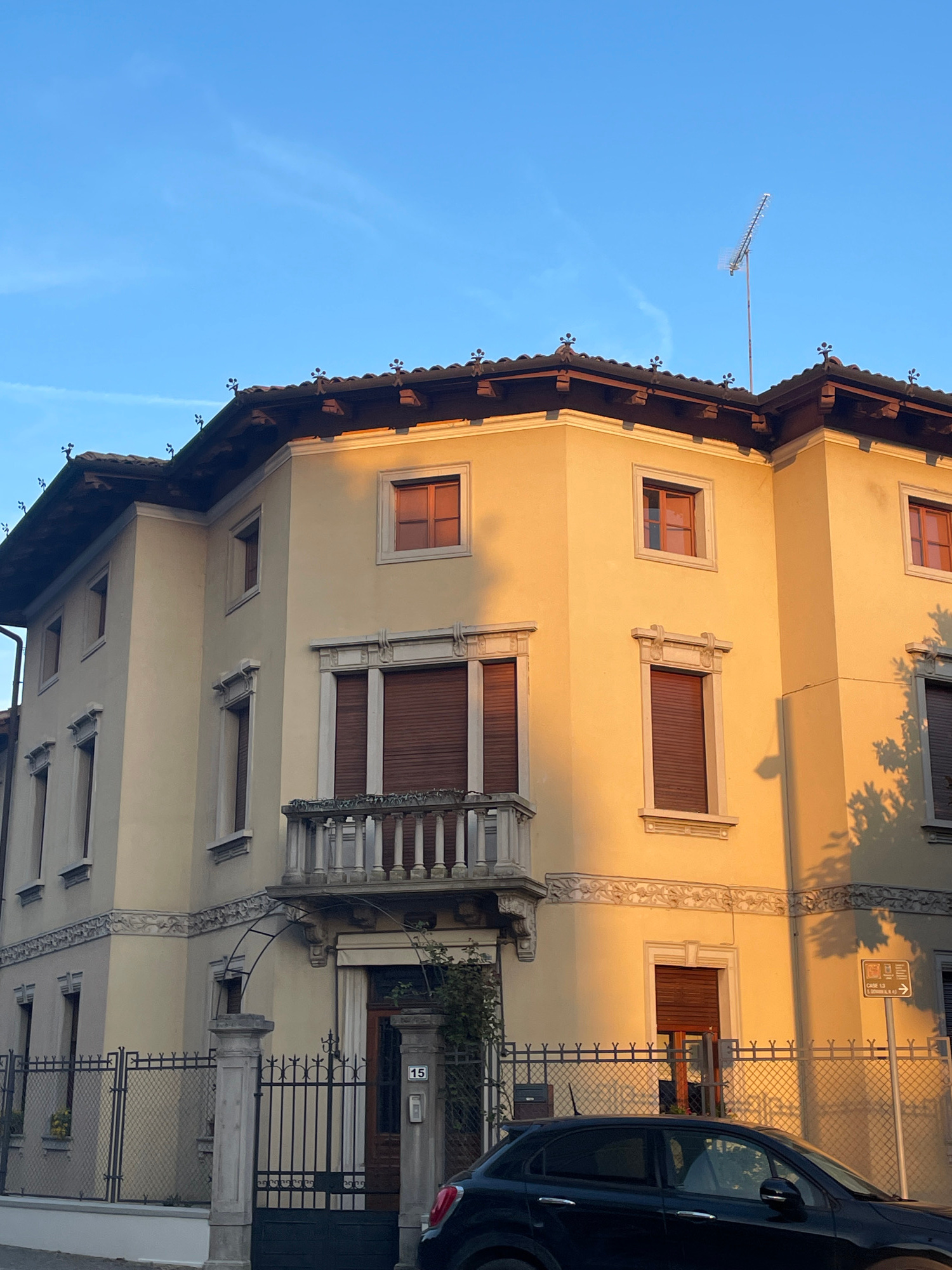 The photograph depicts the facade of a multi-story building in Case/Scjasis, Italy. The building is painted in a pale yellow hue and features windows with dark brown shutters. A wrought-iron balcony i…read more