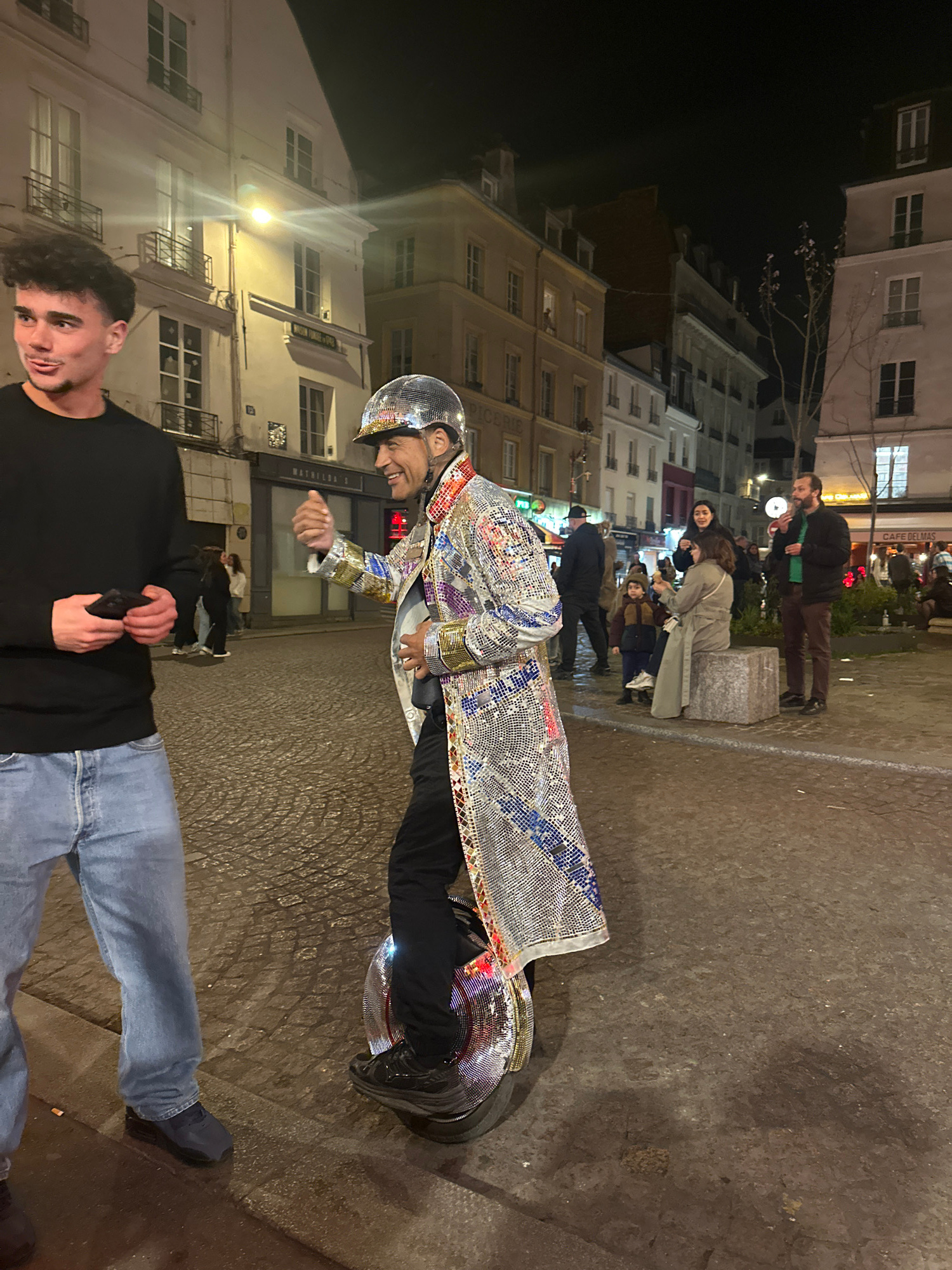 At night in Paris, France, a person wearing a full disco ball helmet and a glittering, mosaic-patterned long coat is riding a motorized unicycle on a cobblestone street. They are giving a thumbs-up ge…read more