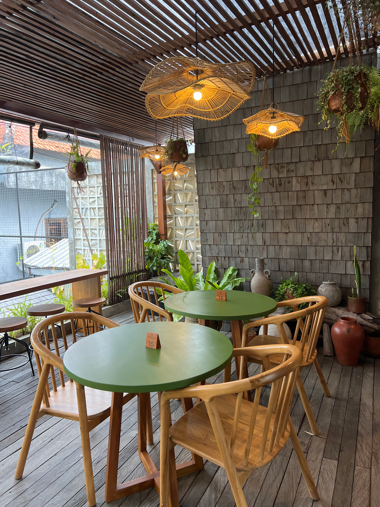 The image depicts an indoor dining area in Singakerta, Indonesia. The space is characterized by wooden flooring and a mix of ceiling treatments: some sections have a wood-shingled pattern, while other…read more