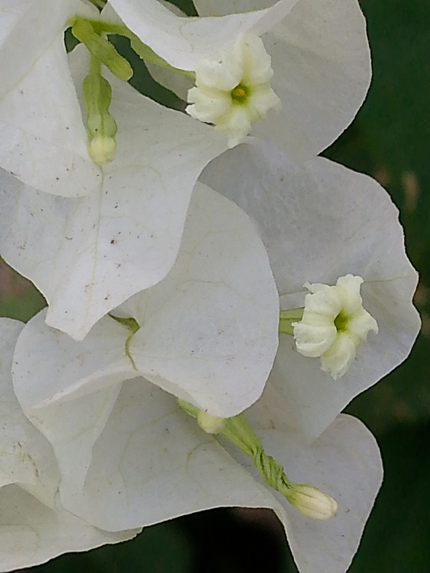 Close-up of white bougainvillea flowers. The location in Juan Griego, Venezuela cannot be confirmed.