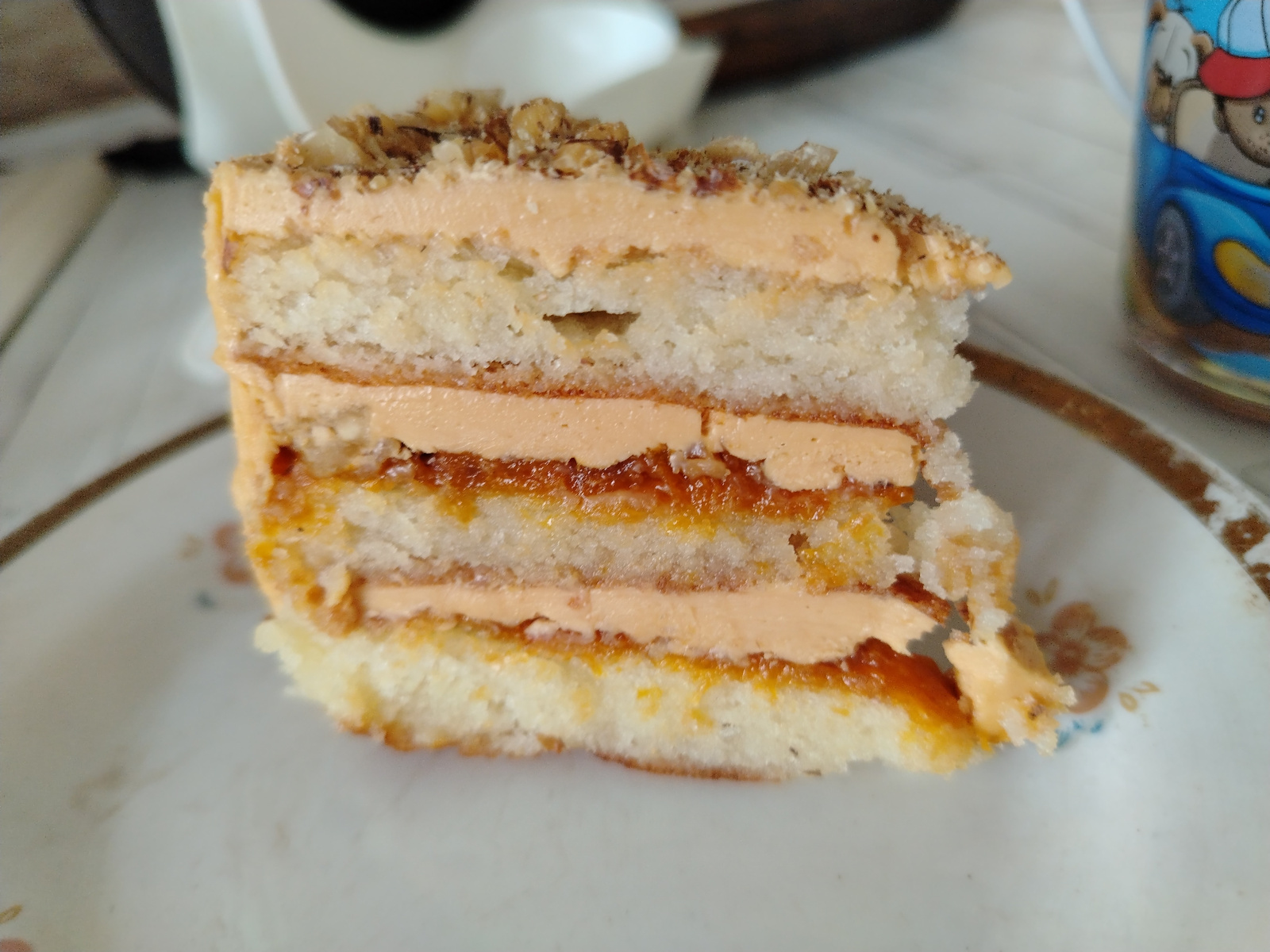 A close-up shot shows a multi-layered slice of cake on a white plate with a patterned rim. The cake consists of several layers of white sponge cake interspersed with layers of orange-colored cream andβ¦read more