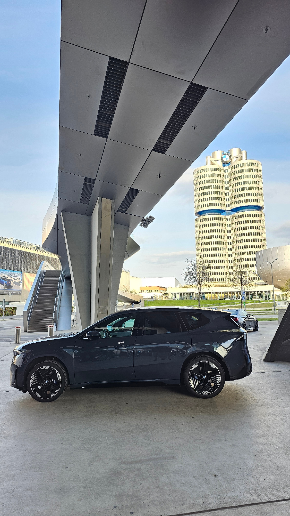 The image shows a dark blue BMW i3 electric car parked in front of a modern building with a distinctive architectural design. In the background is the iconic BMW headquarters building in Munich, Germa…read more