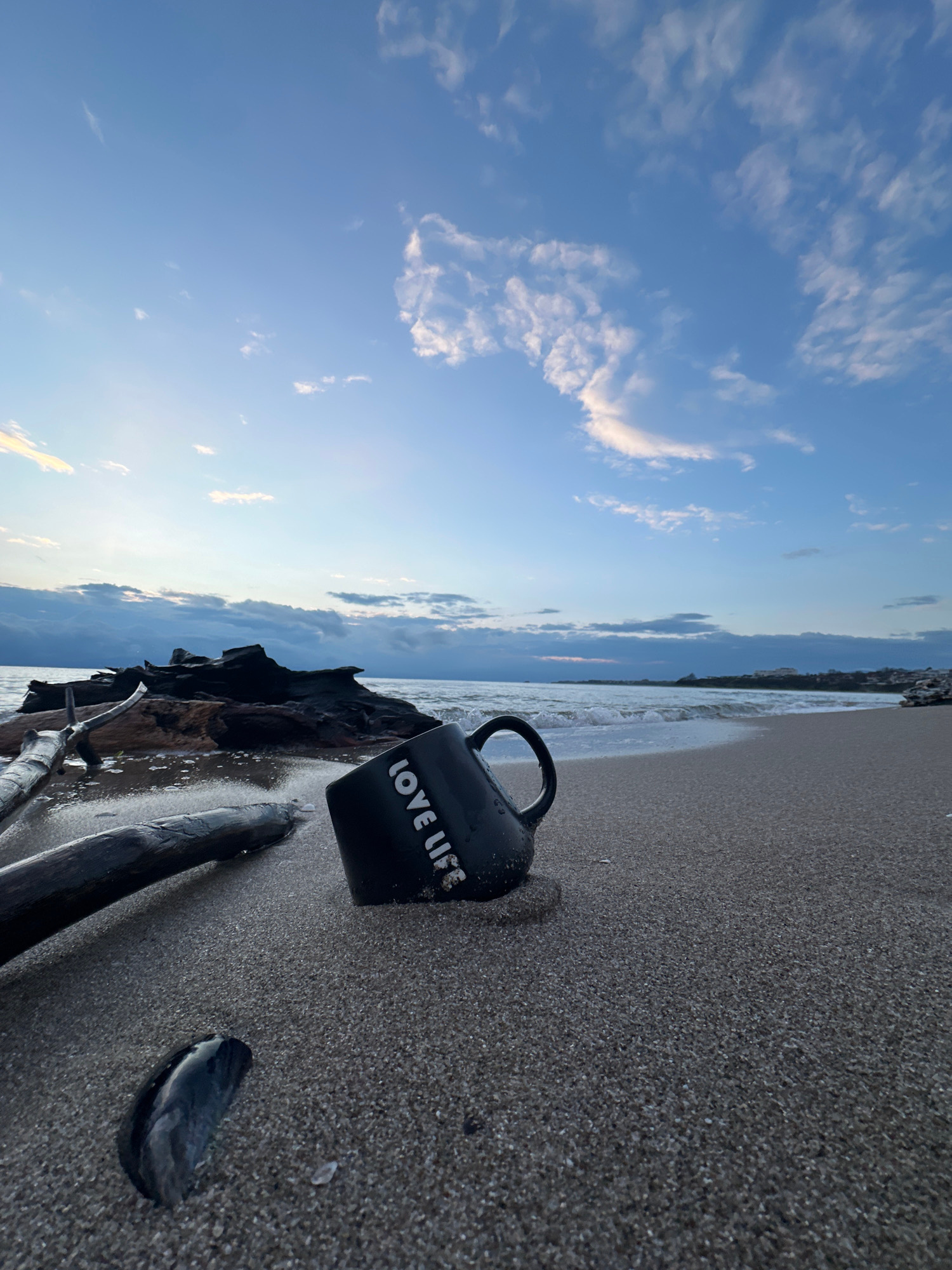 The image shows a beach scene, likely in Kiten, Bulgaria, given the environment. A black mug with the inscription "LOVE LIFE" in white is positioned on the sandy shore. The mug is near some driftwood…read more