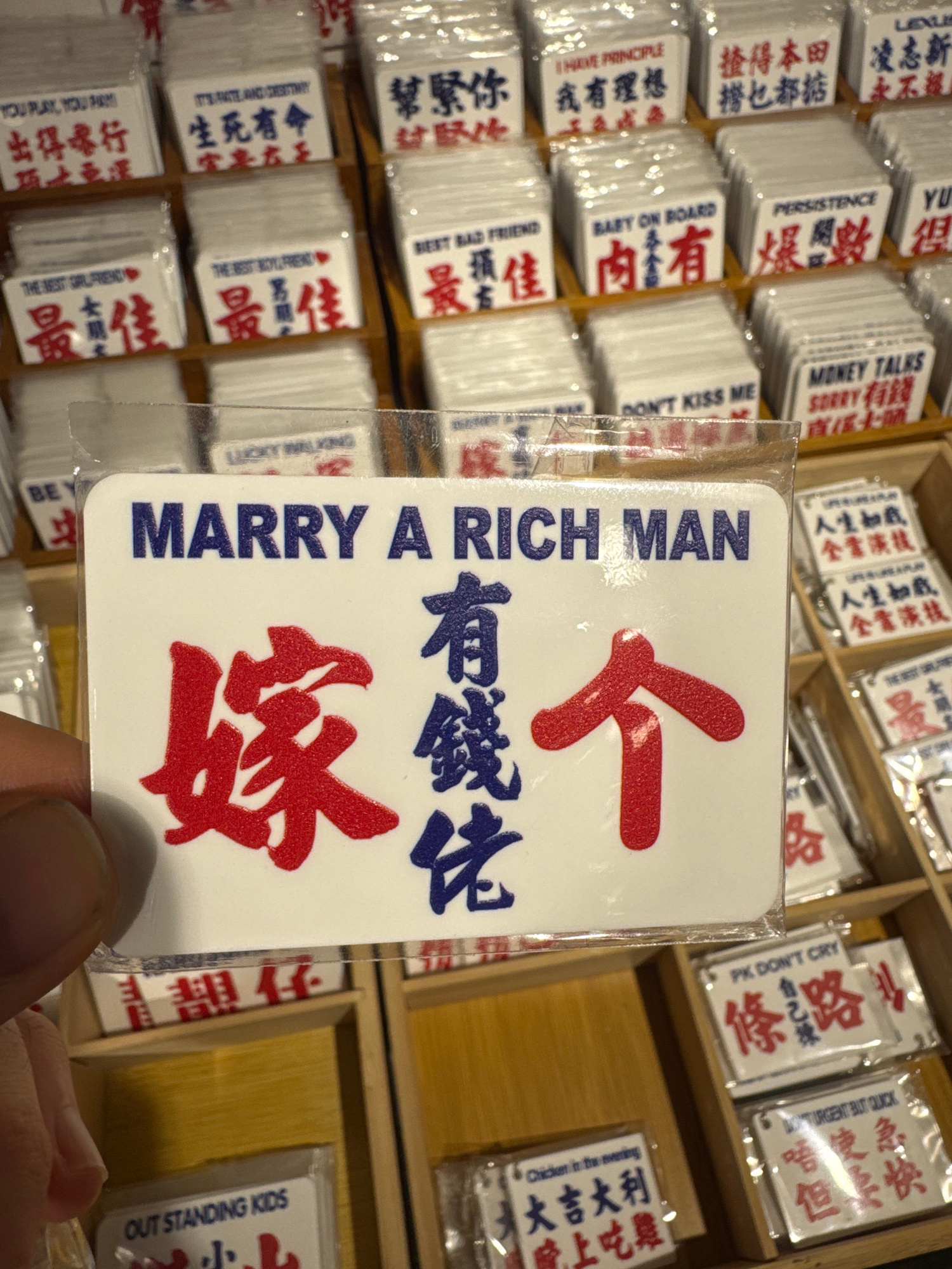 A person is holding a packaged card in a shop or market, likely in the Liwan District, China, given the presence of Chinese characters on many cards. The card the person holds is white with blue textβ¦read more