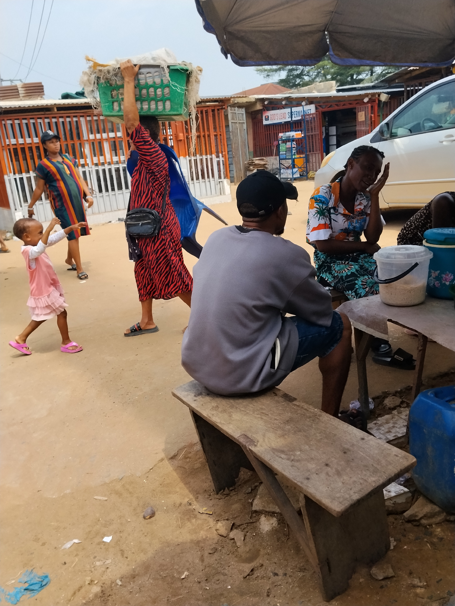 In Ura Nta Umuarandu, Nigeria, a street scene unfolds on a dirt ground. A man in a gray shirt and black cap sits on a worn wooden bench, his back to the viewer. Beside him, a table holds a clear plast…read more