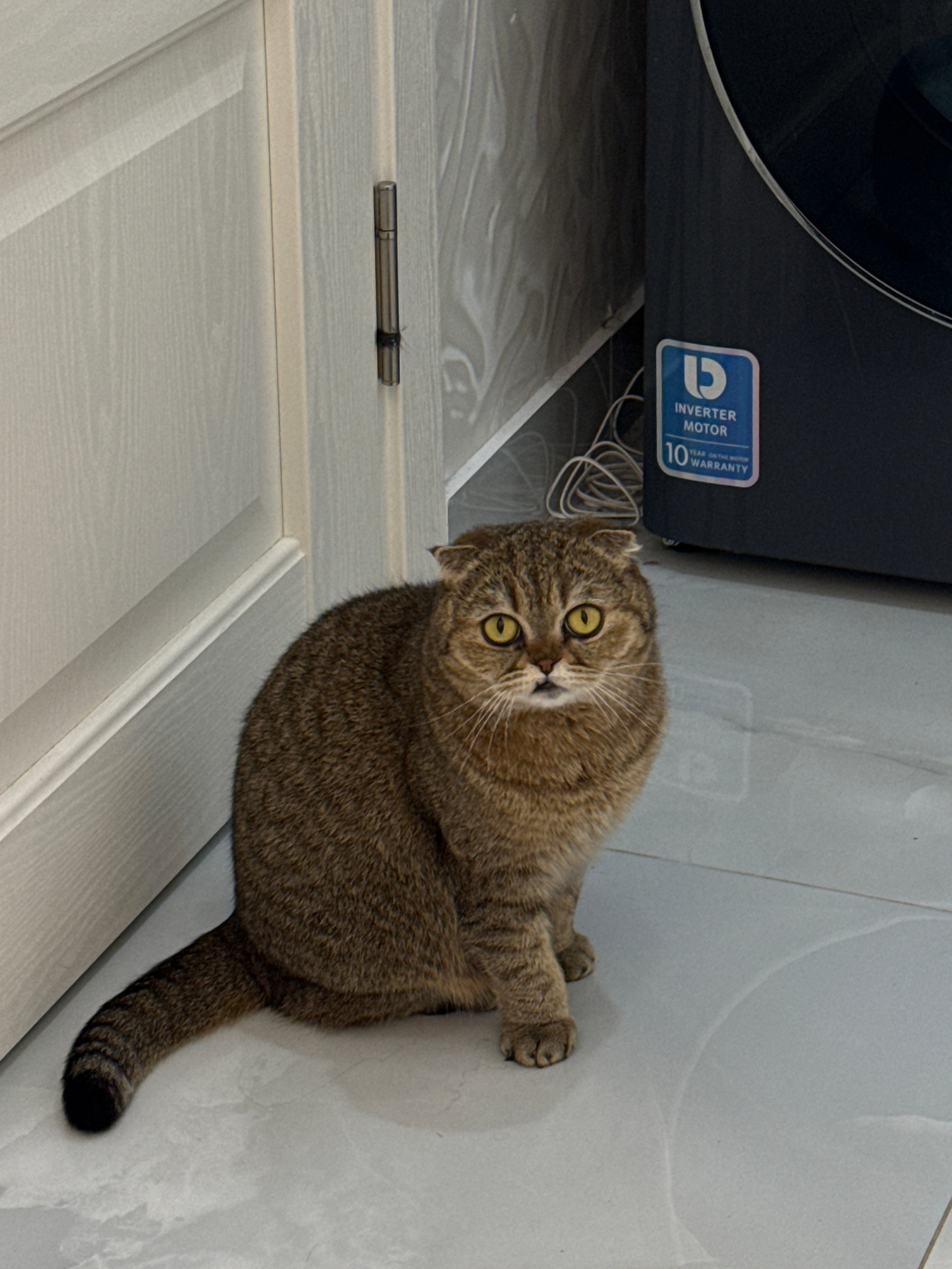 A brown, tabby Scottish Fold cat with golden eyes sits on a light-colored tiled floor, looking upwards at the camera. The cat is positioned next to a washing machine bearing a sticker that reads "Inve…read more