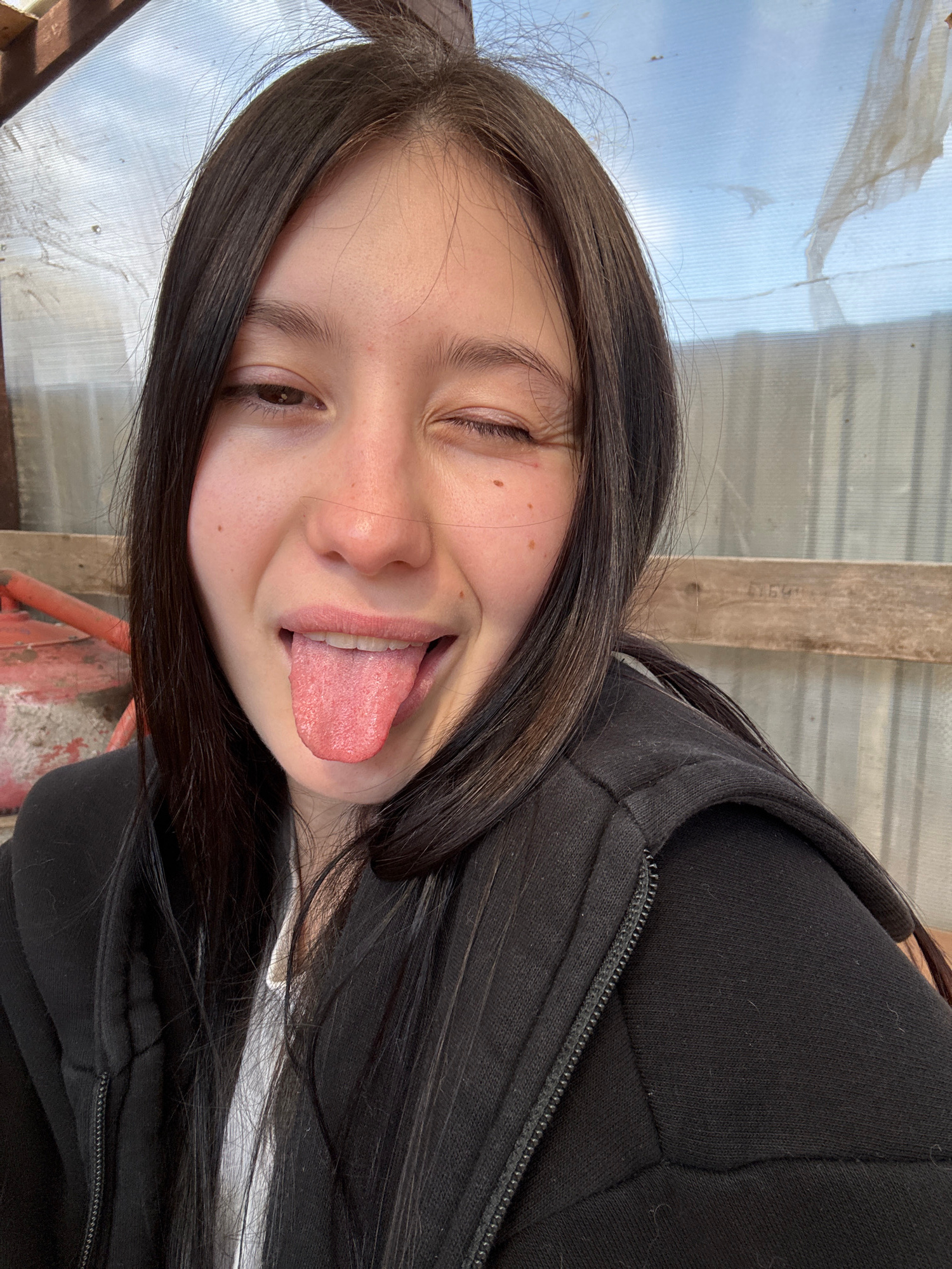 A young woman with dark hair, wearing a black zip-up hoodie over a white shirt, is making a silly face with her tongue sticking out and one eye squinted. The background appears to be a weathered struc…read more
