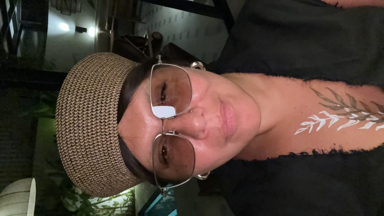 Two people are in a bar setting. A man with a beard and hair pulled back in a bun sits at the bar, wearing a white shirt, tan pants, and sandals. A woman with long curly hair lies on the floor in fron…read more