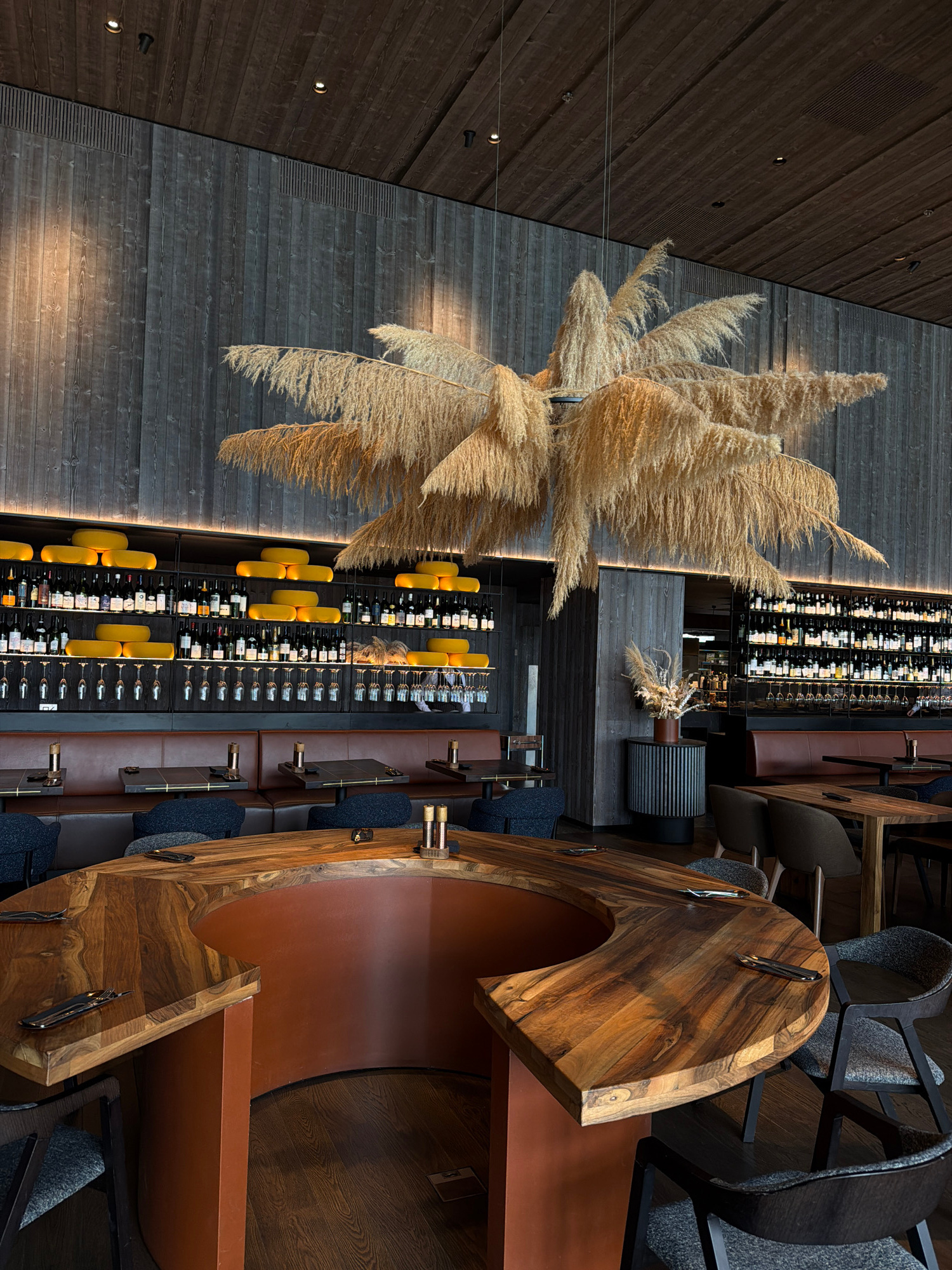 This image captures an overhead view of a sophisticated interior space, likely a bar or restaurant, characterized by a blend of rustic and modern design elements. The central subject is a very large,…read more